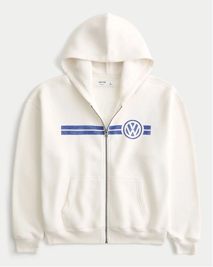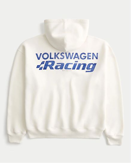 Модная мужская толстовка Hollister кремового оттенка с официальным принтом Volkswagen Racing спереди и на спине: застёжка на молнии, капюшон, передние карманы и длинные рукава.