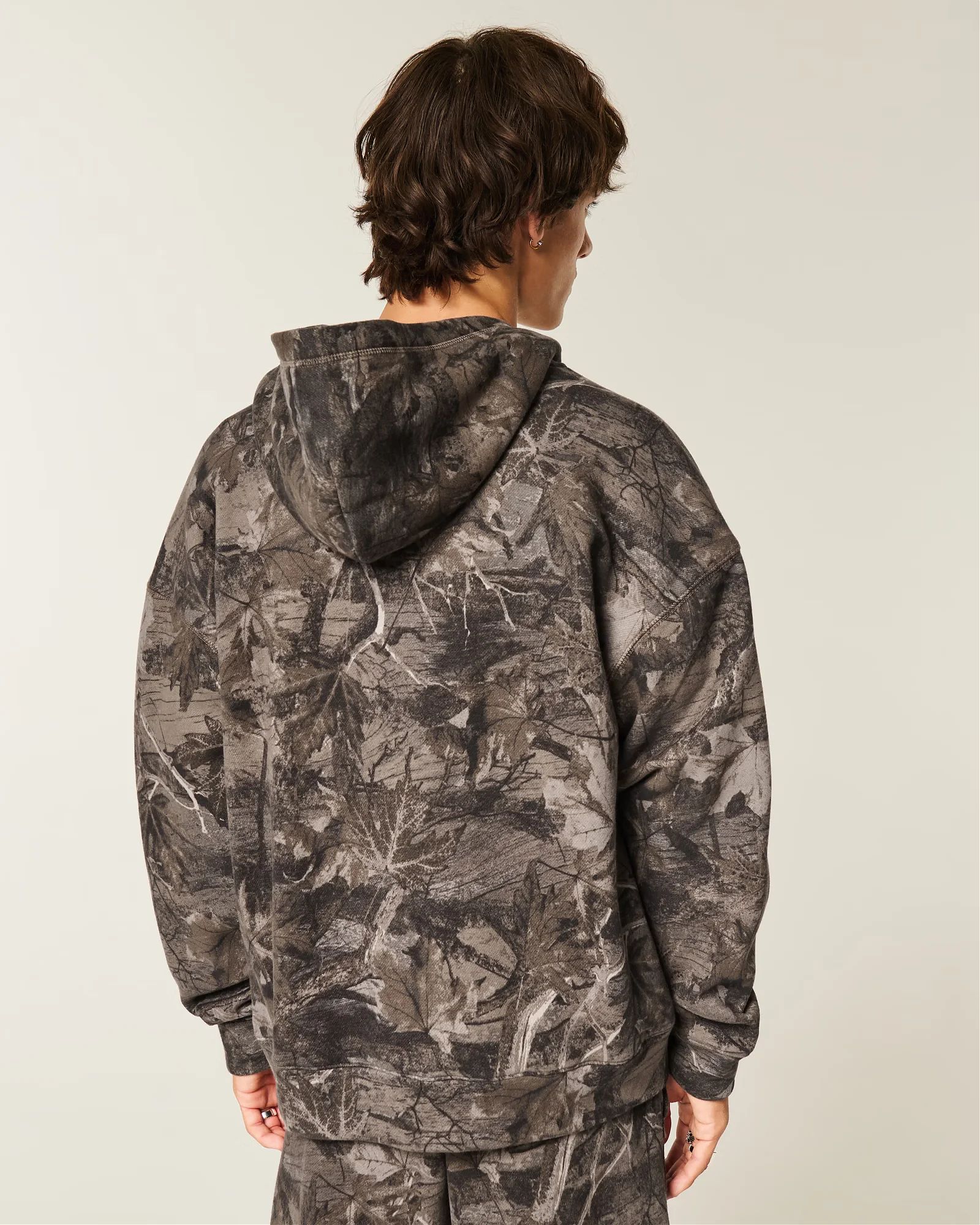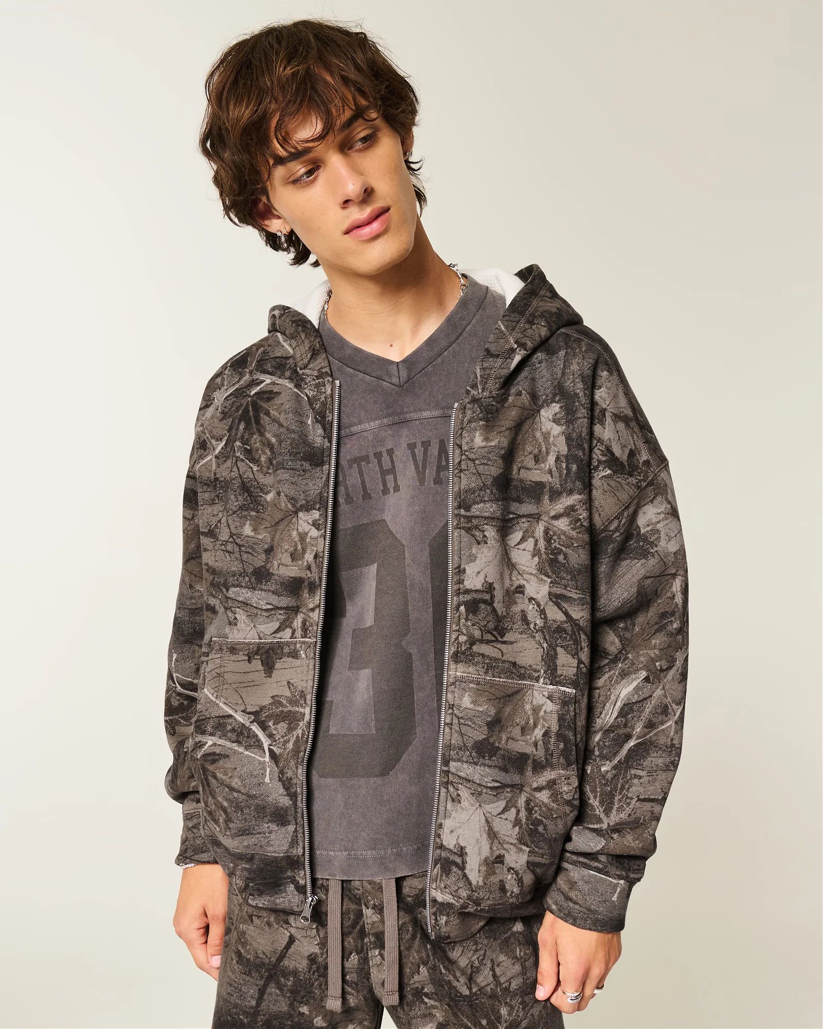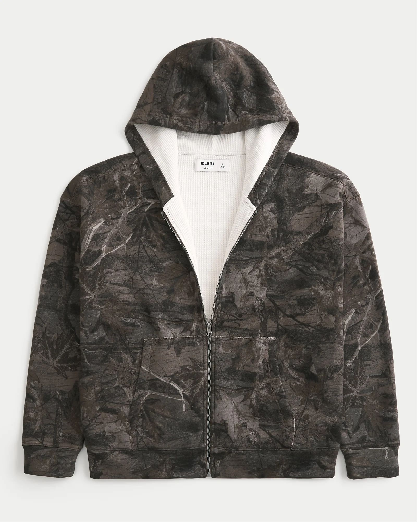 Комфортная мужская толстовка худи Hollister камуфляжного цвета из мягкого флиса с термоподкладкой вафельной фактуры: застёжка на молнии, капюшон, передние карманы и длинные рукава.