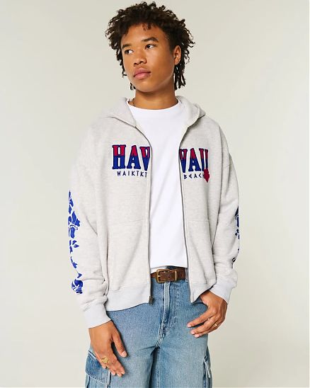 Комфортный мужской свитшот Hollister светло‑серого оттенка: прямая посадка Boxy Fit, полная молния, передние карманы, вышивка Waikiki Beach Hawaii на груди и принт на рукавах.
