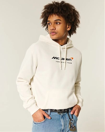 Модная мужская толстовка Hollister McLaren белого оттенка: расслабленная посадка, капюшон на шнурках, карман‑кенгуру, эластичные манжеты и фирменная графика спереди и сзади.