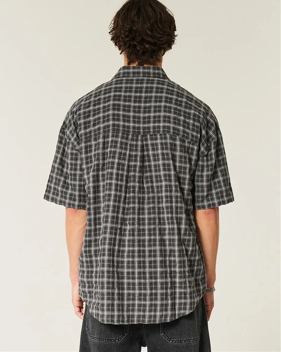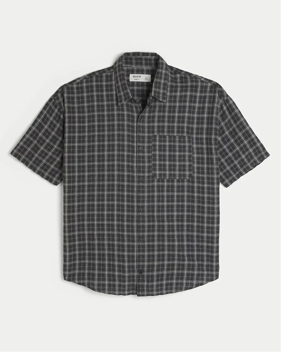 Мужская рубашка Hollister чёрного клетчатого оттенка: объёмная посадка, отложной воротник, накладной карман слева и планка на пуговицах по всей длине.