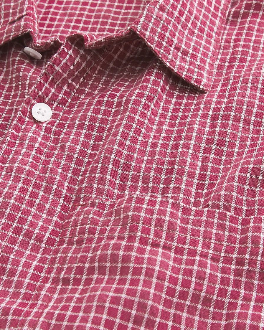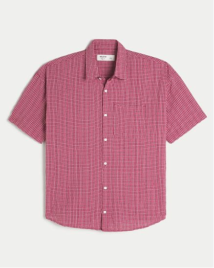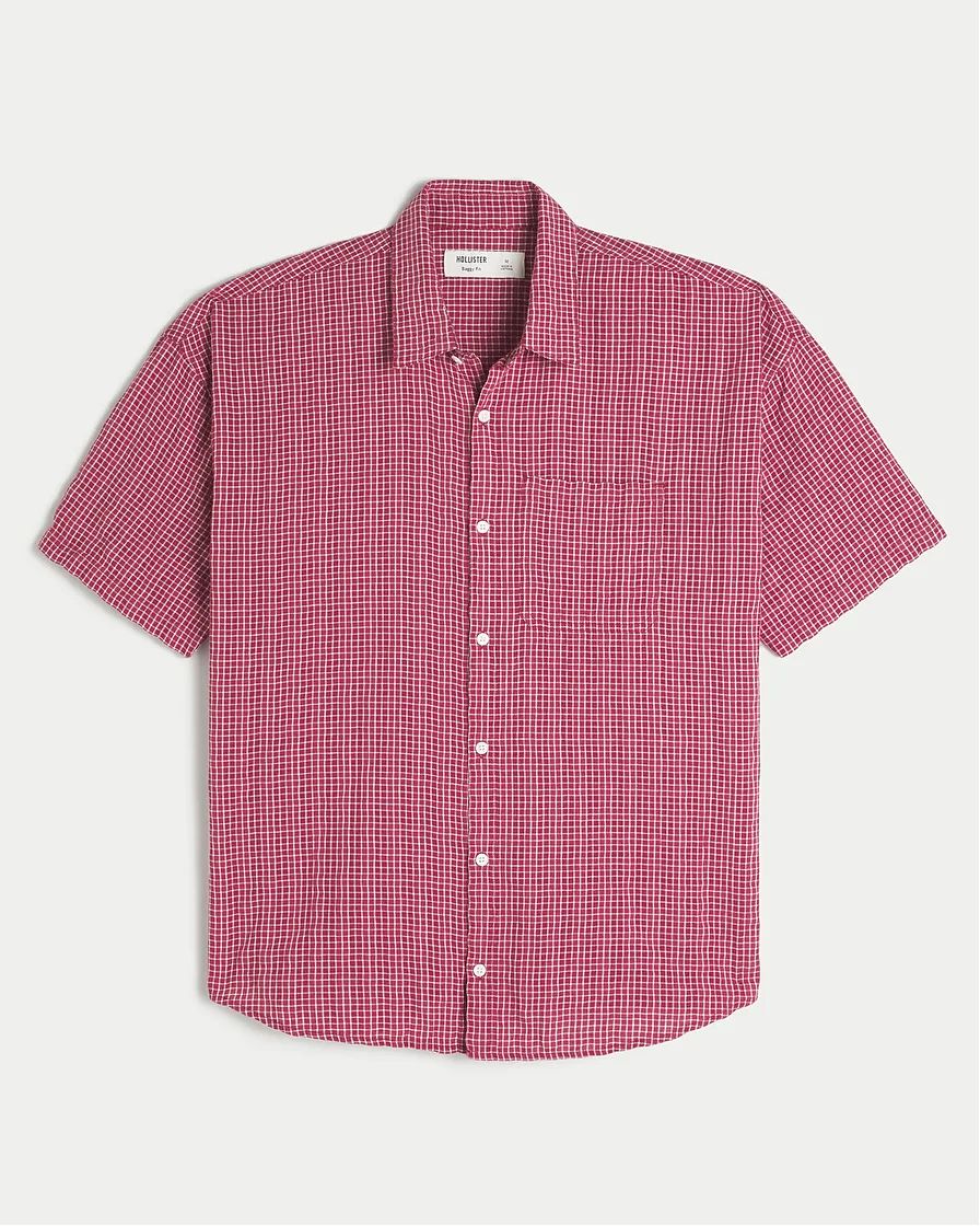 Оригинальная мужская рубашка Hollister красного клетчатого оттенка: объёмная посадка, отложной воротник, накладной карман слева и полная планка на пуговицах.
