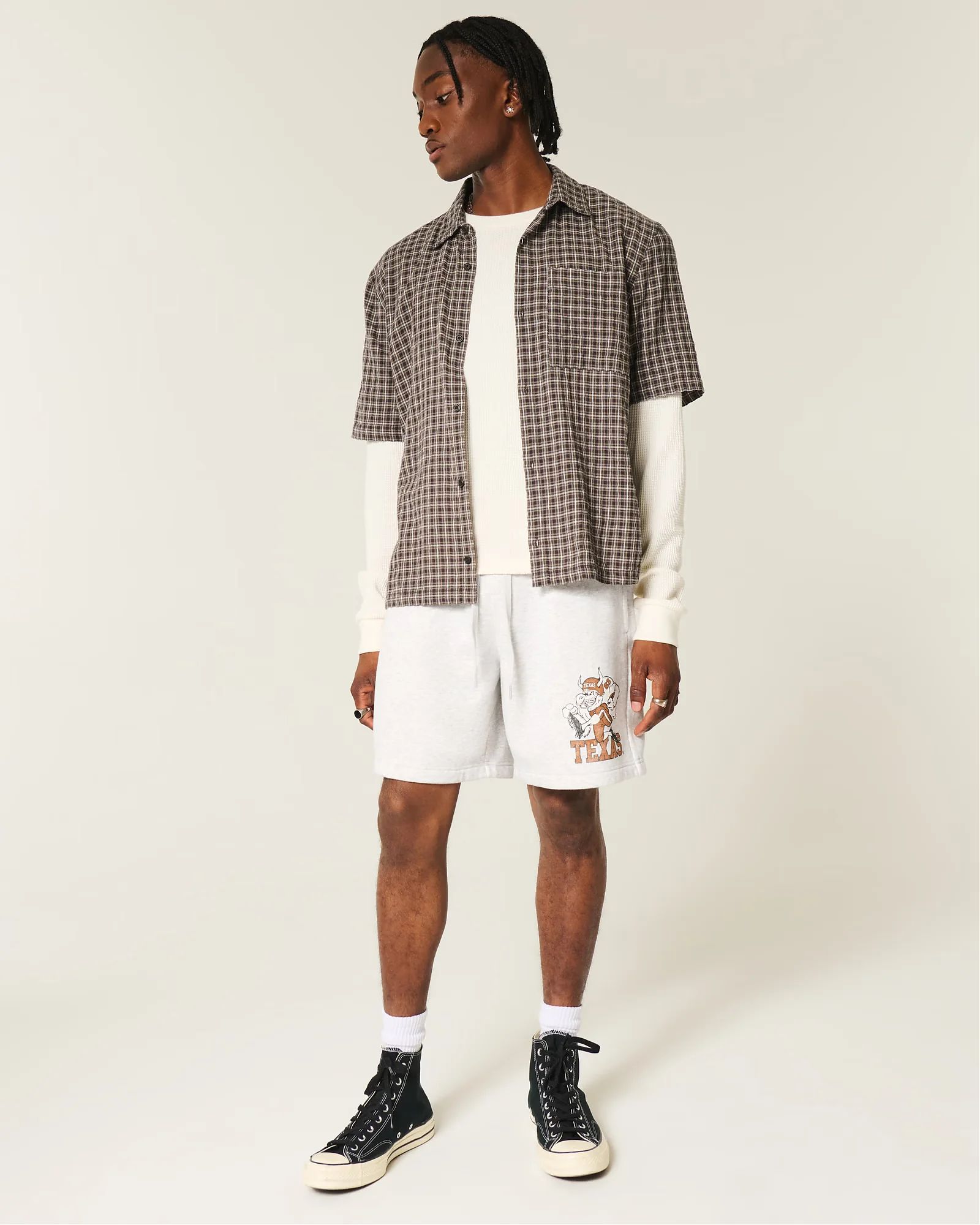 Комфортные мужские флисовые шорты Hollister светло-серого меланжа с принтом Университет Техаса, поясом на шнурке и карманами, включая карман на молнии справа. Мягкая ткань подходит для отдыха и повседневной носки.