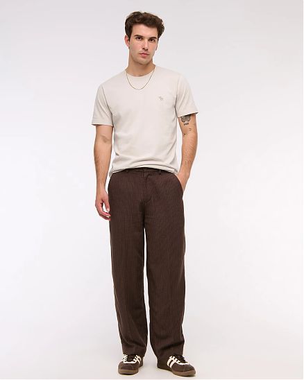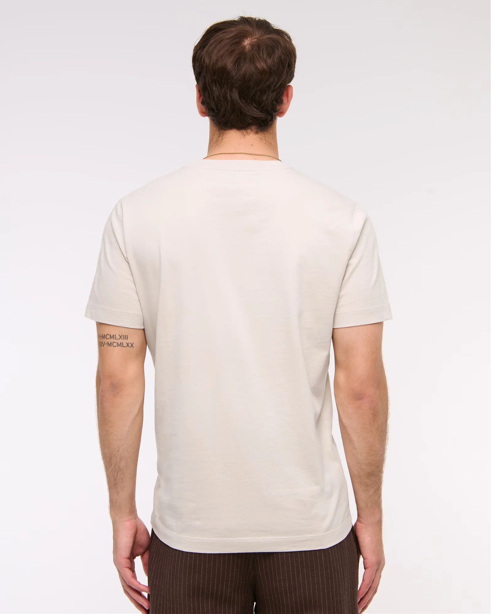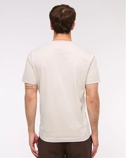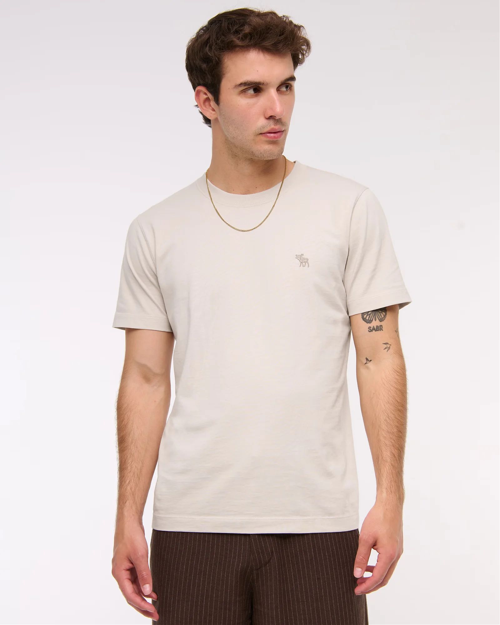 Комфортная мужская футболка серо-бежевого цвета Abercrombie & Fitch слим-кроя из мягкого плотного трикотажа softAF 210 г/м² с гладкой отделкой. Классический круглый вырез, короткие рукава и фактурный логотип на груди.