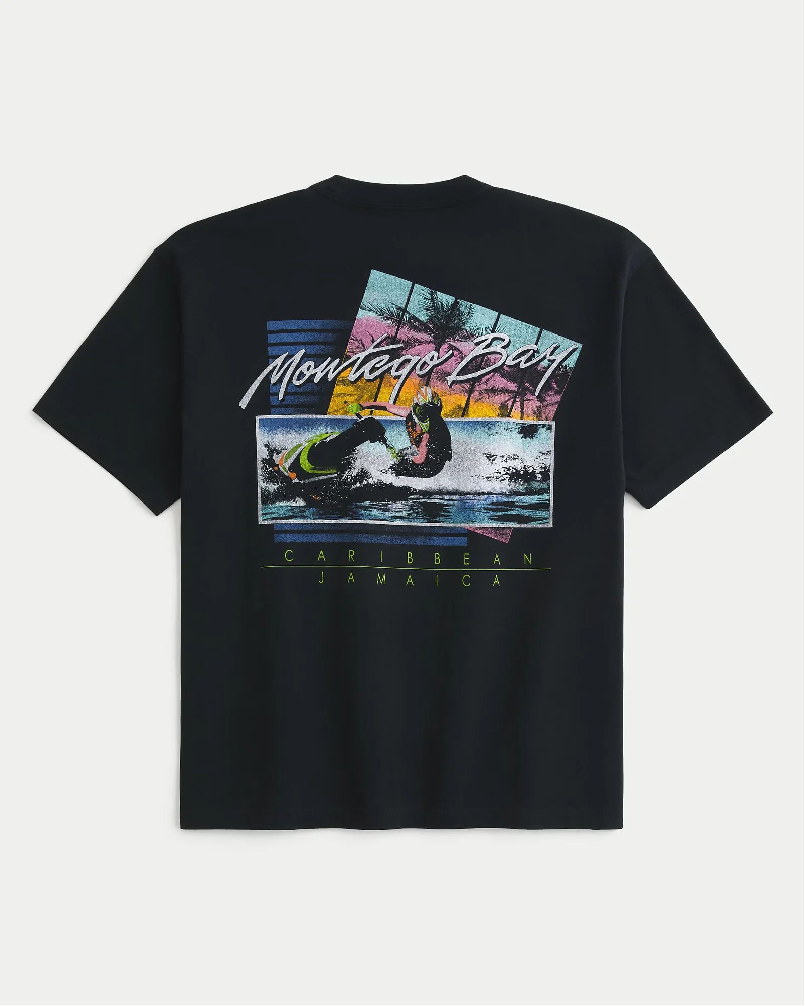 Мужская футболка Hollister черного цвета: прямая посадка Boxy Fit, круглый вырез, принт Монтего бэй Ямайка на груди и на спине.