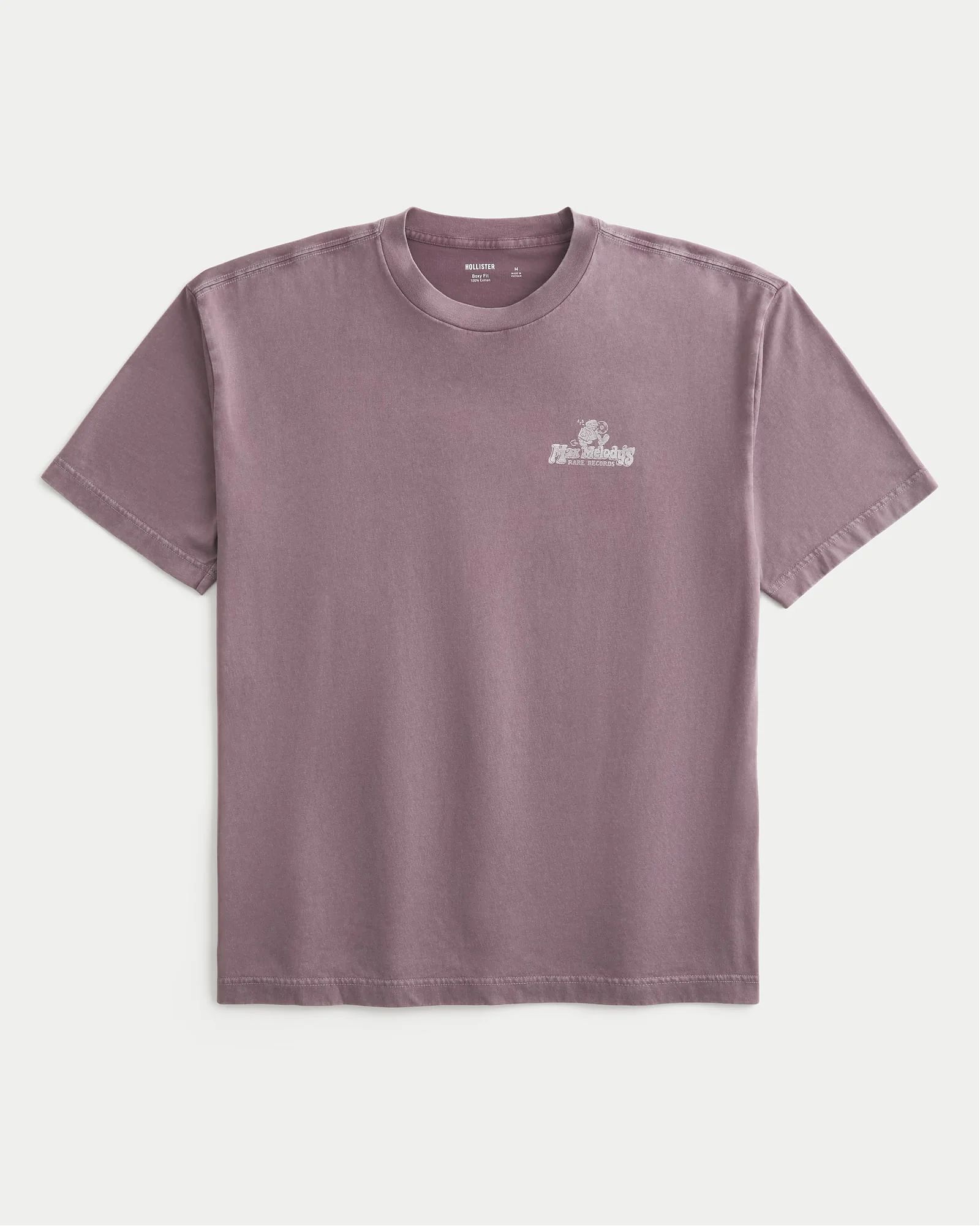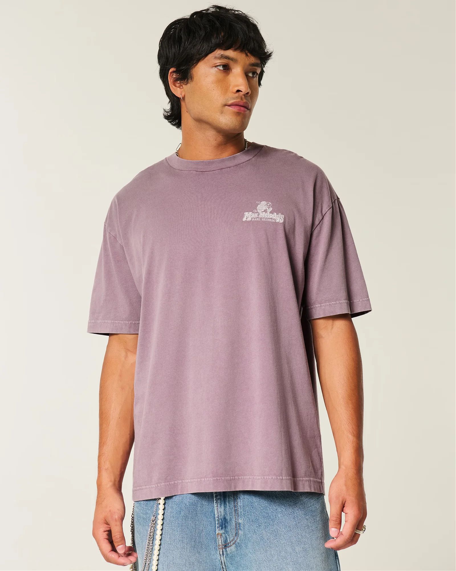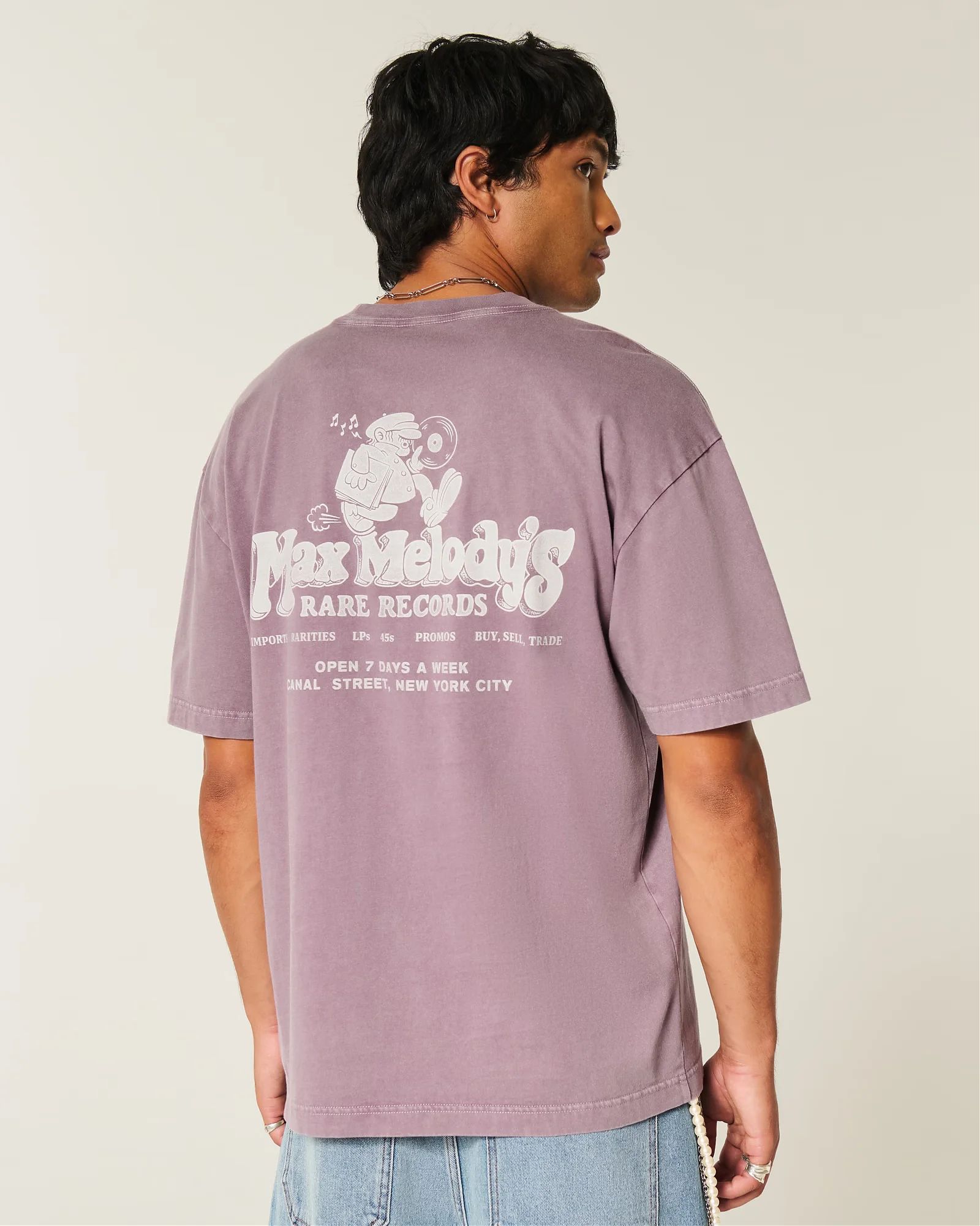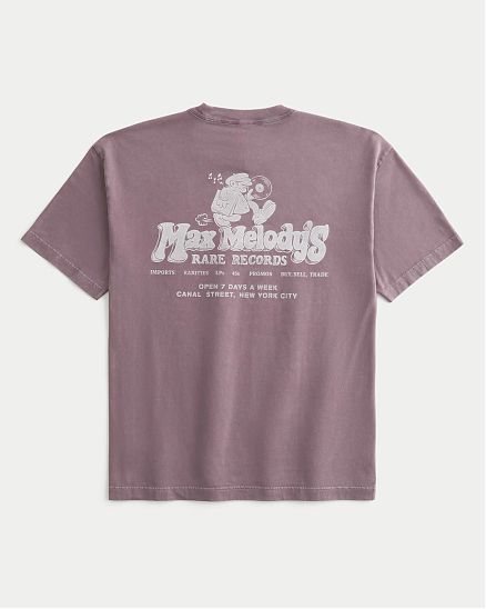 Оригинальная мужская футболка Hollister лилового оттенка из мягкого хлопка с принтом «Макс Мелоди, Рэр Рекордс, Нью‑Йорк» на груди и спине, круглым вырезом и короткими рукавами, выполнена в бокс‑фите.