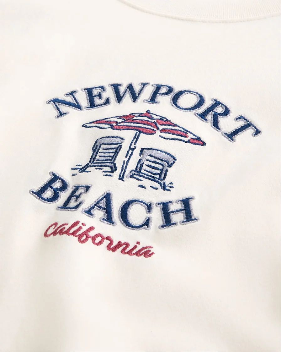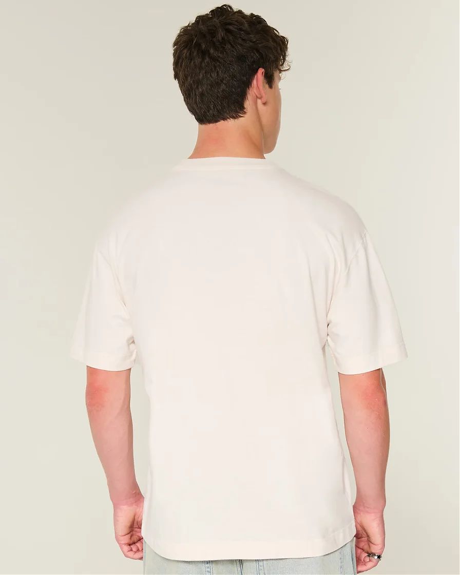 Комфортная мужская футболка Hollister белого цвета: прямая посадка Boxy Fit, плотный трикотаж heavyweight, круглый вырез и графика Newport Beach на груди.