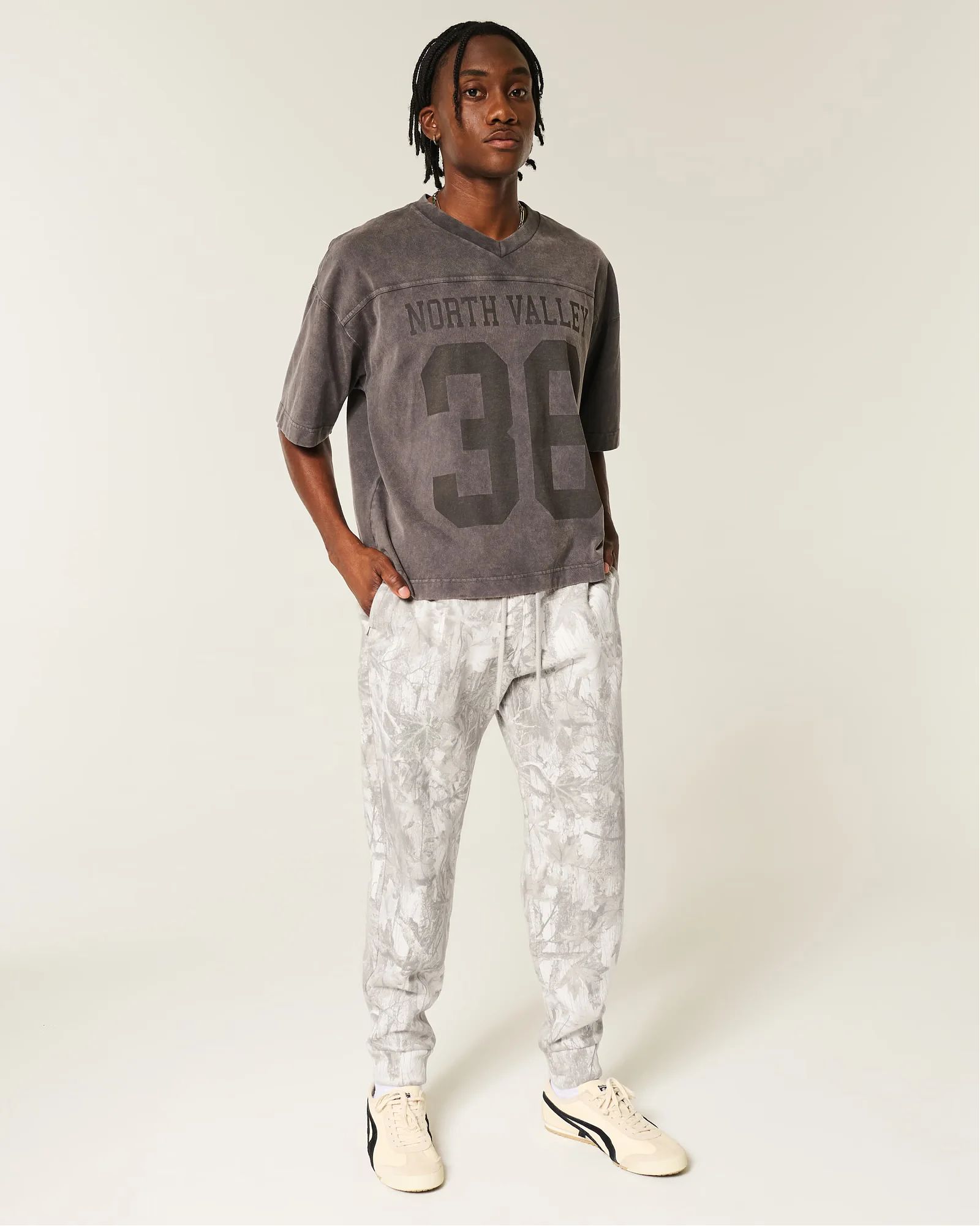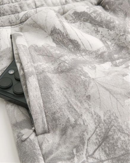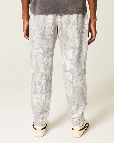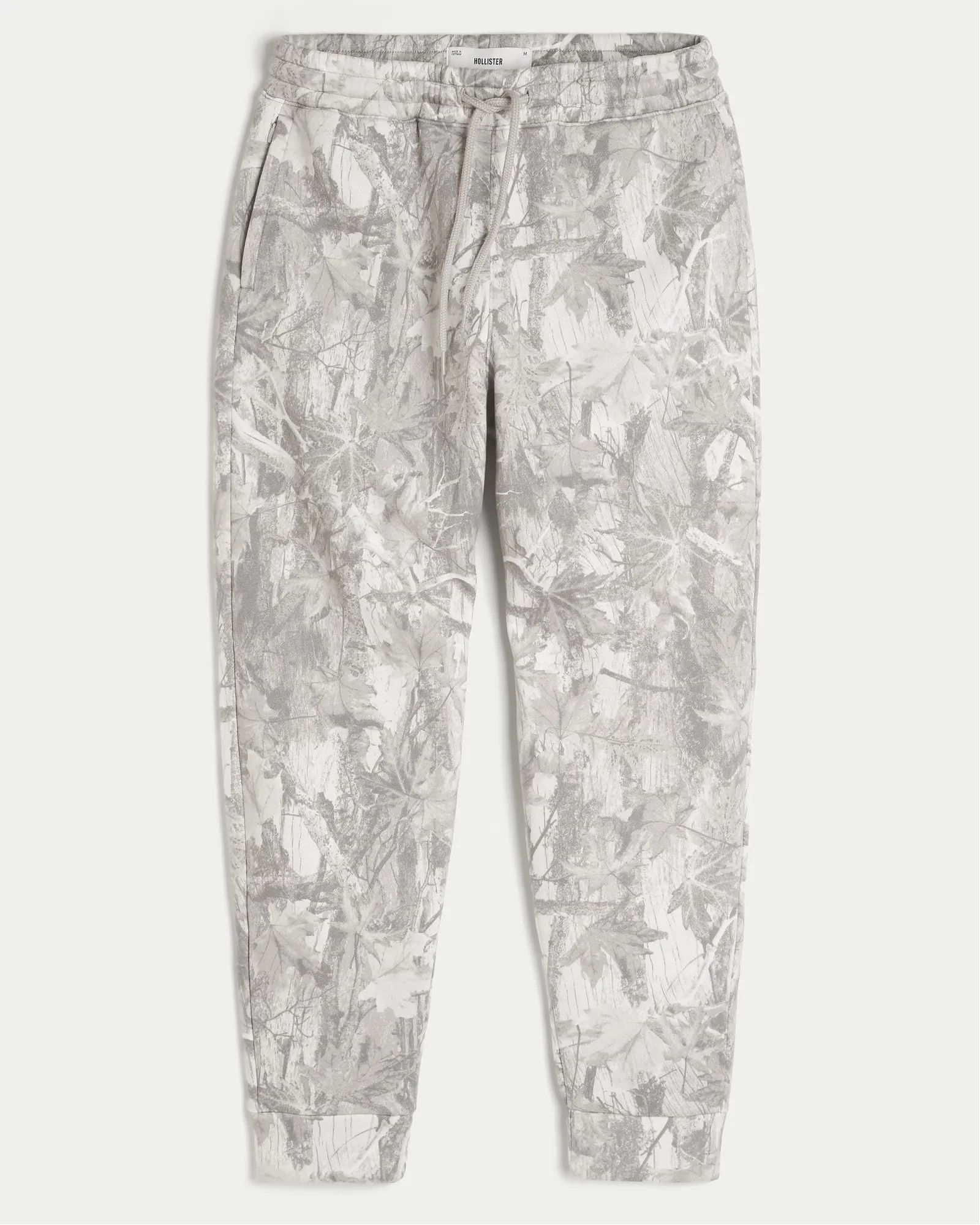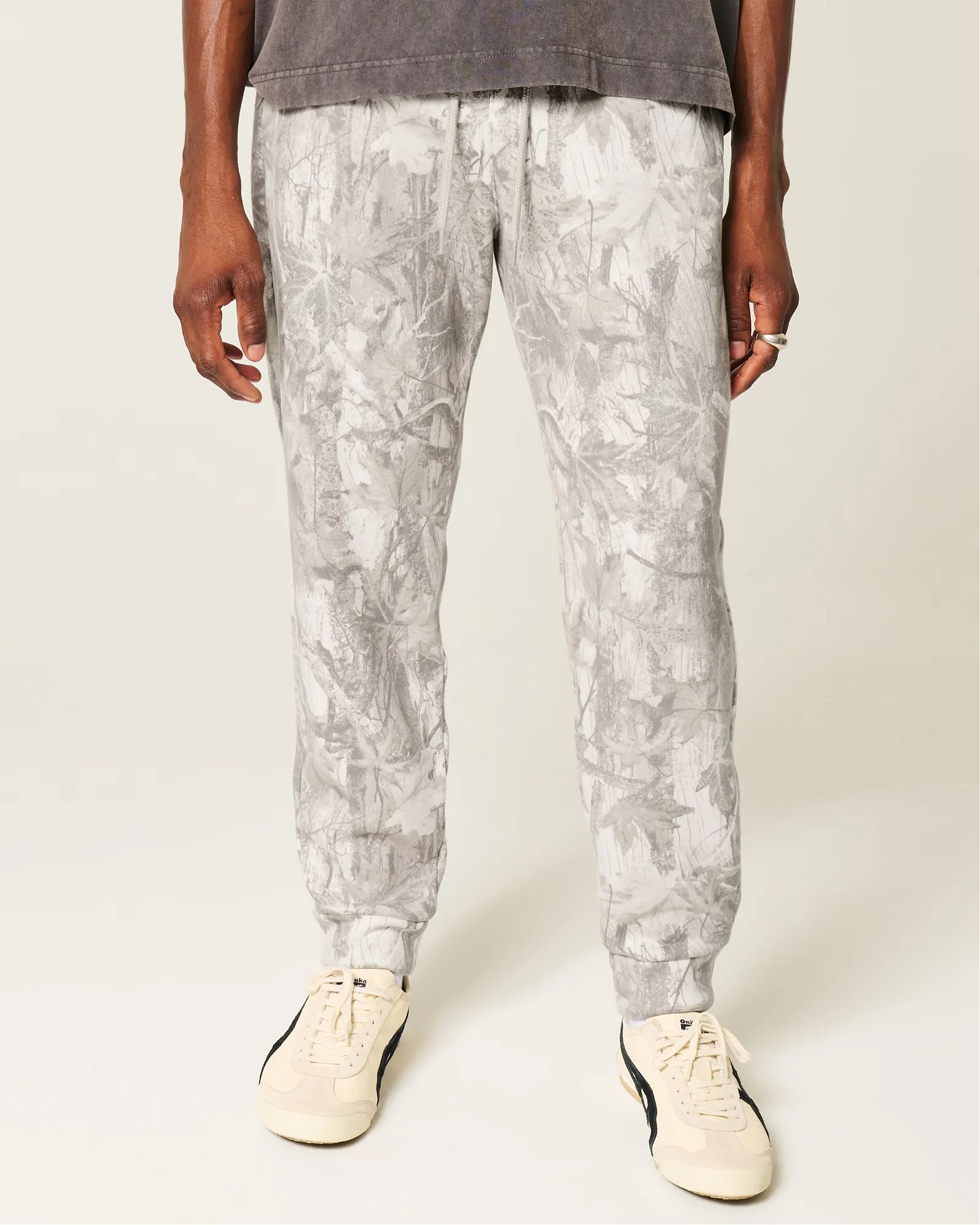 Комфортные мужские джоггеры Hollister кремового цвета с камуфляжным принтом, мягким флисом, поясом на шнурке и карманами, включая карман на молнии. Манжеты по низу делают модель удобной для повседневной носки.