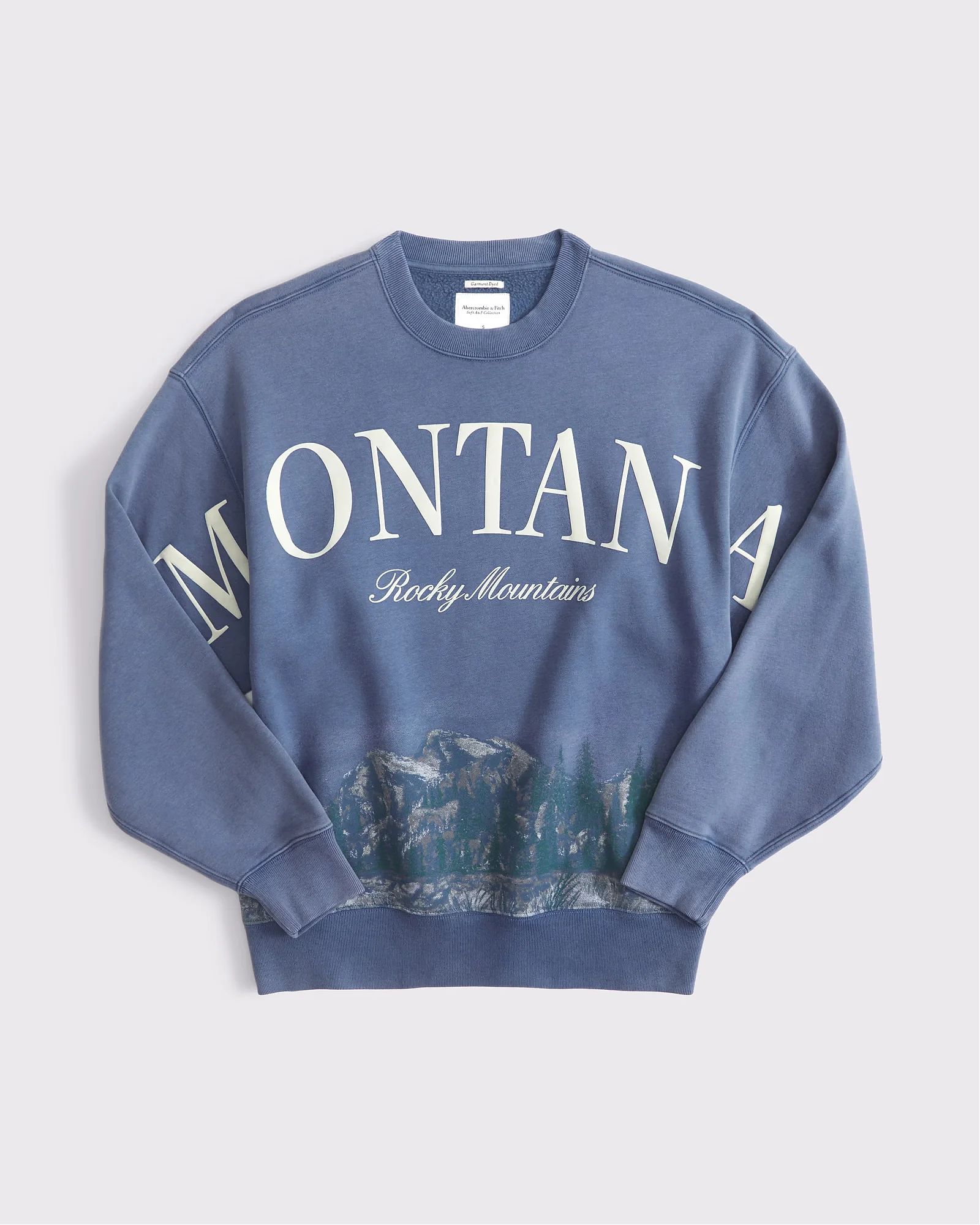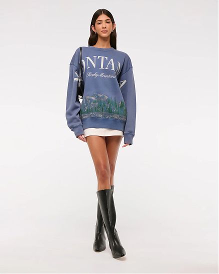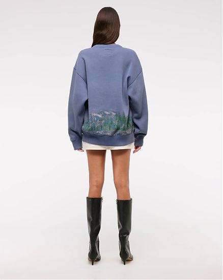 Удобный свитшот Abercrombie & Fitch синего цвета с фирменным принтом на груди и спине. Фирменный флис Soft A&F и удобная длина для леггинсов. Широкая линия груди, графические детали в стиле горнолыжных курортов, вырез и окантовка снизу и на манжетах.