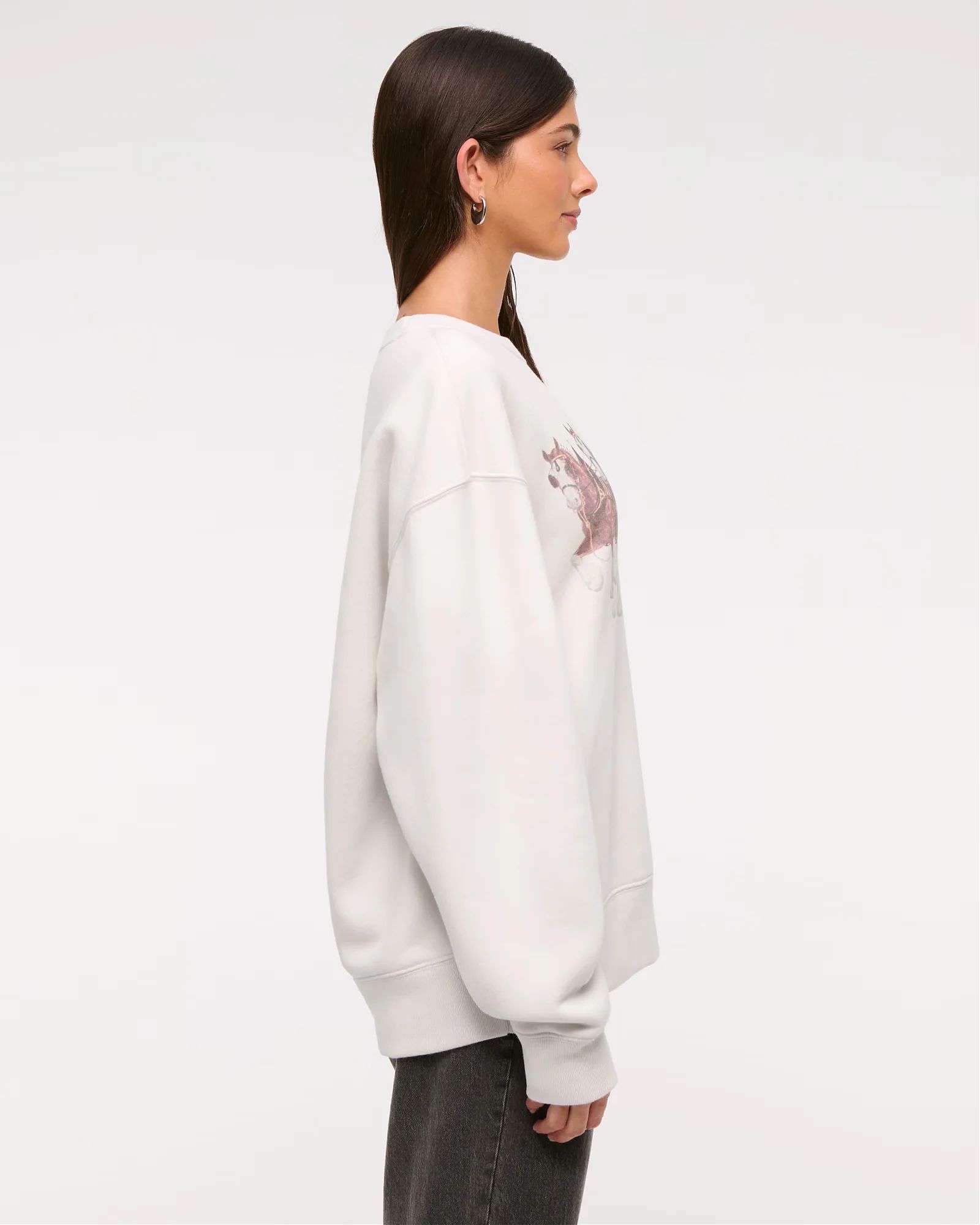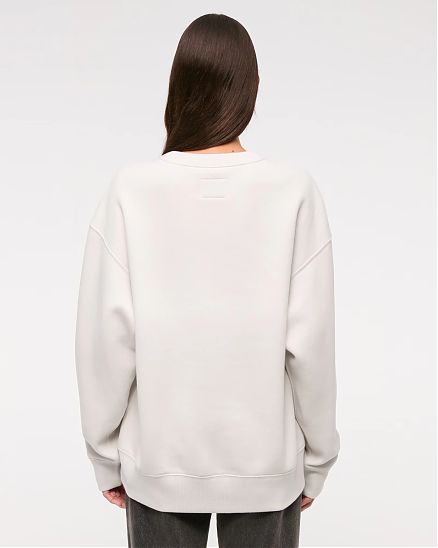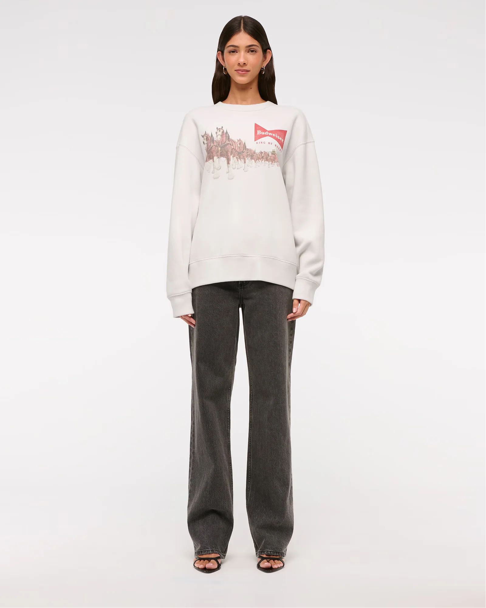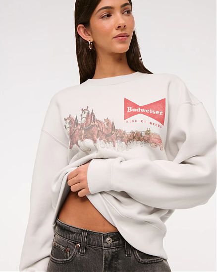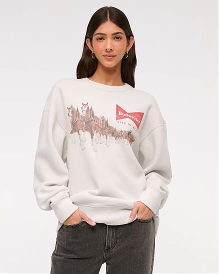 Комфортный женский свитшот Abercrombie & Fitch светло‑бежевого оттенка с винтажным принтом Budweiser. Плотный мягкий флис, круглый вырез, эластичные манжеты и пояс, длина комфортна для леггинсов.