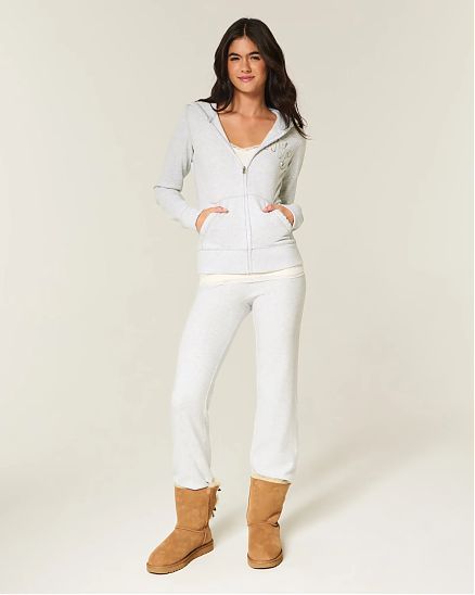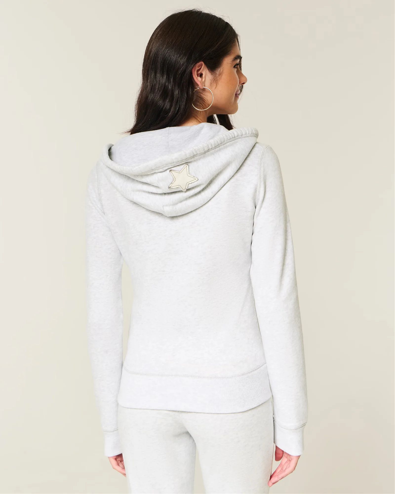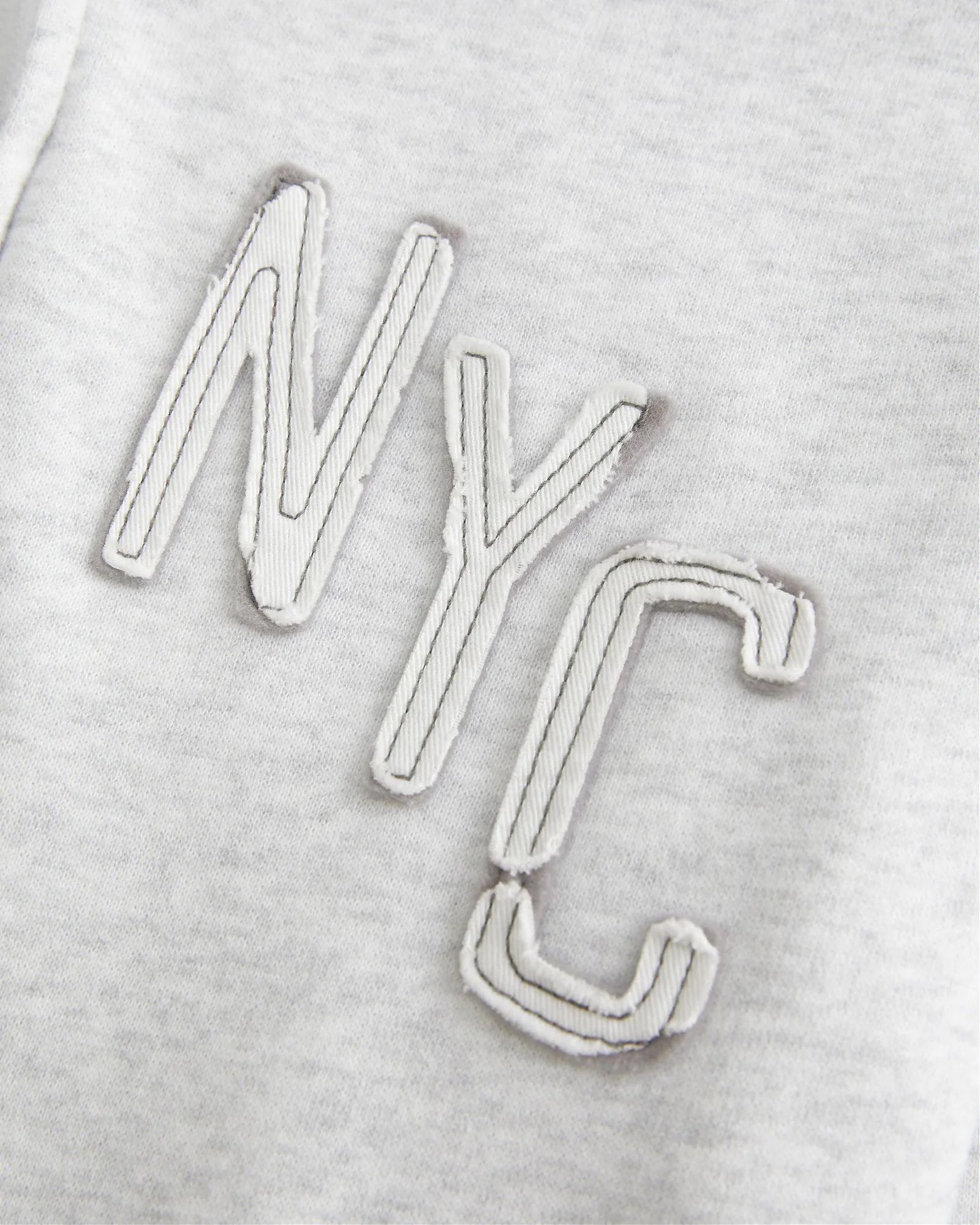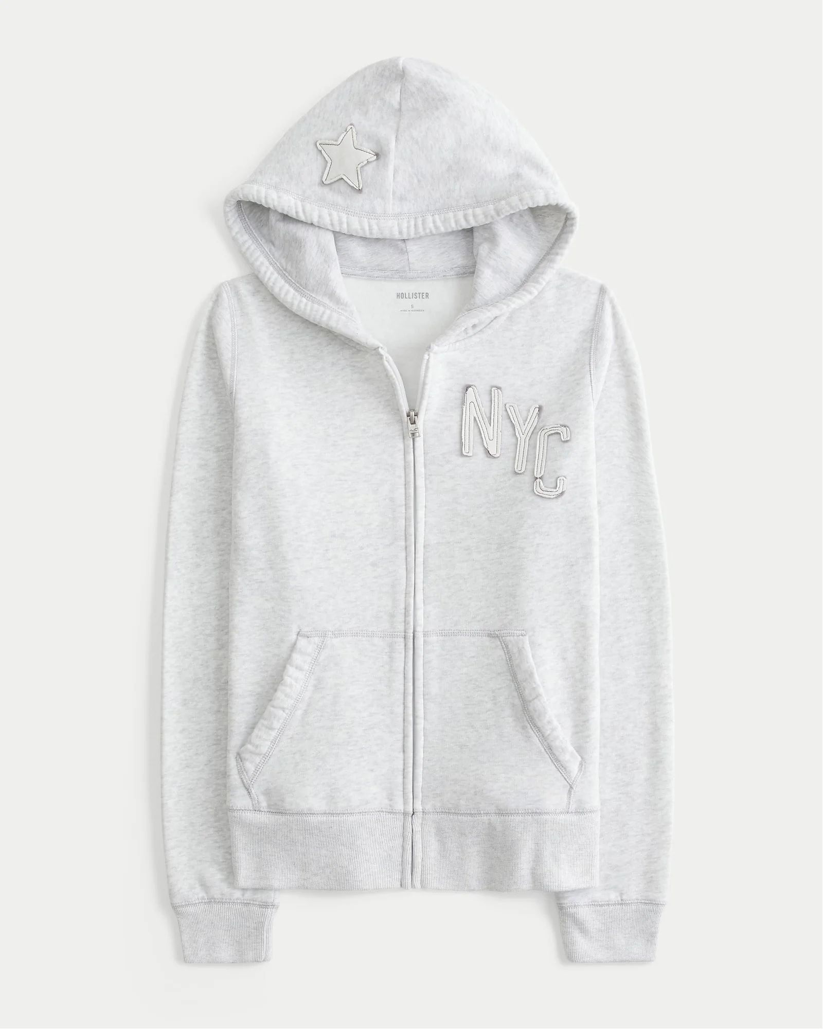 Комфортная женская толстовка Hollister на молнии цвета светло-серый меланж из мягкого флиса с капюшоном и принтом Нью-Йорк. Приталенная посадка.