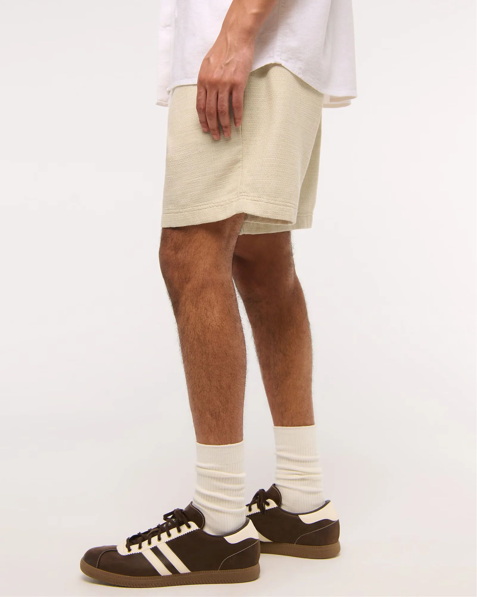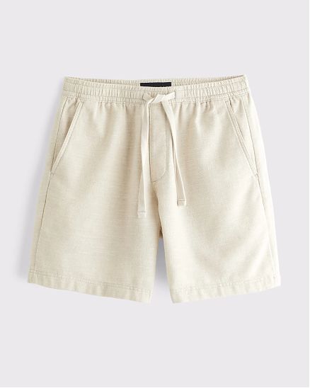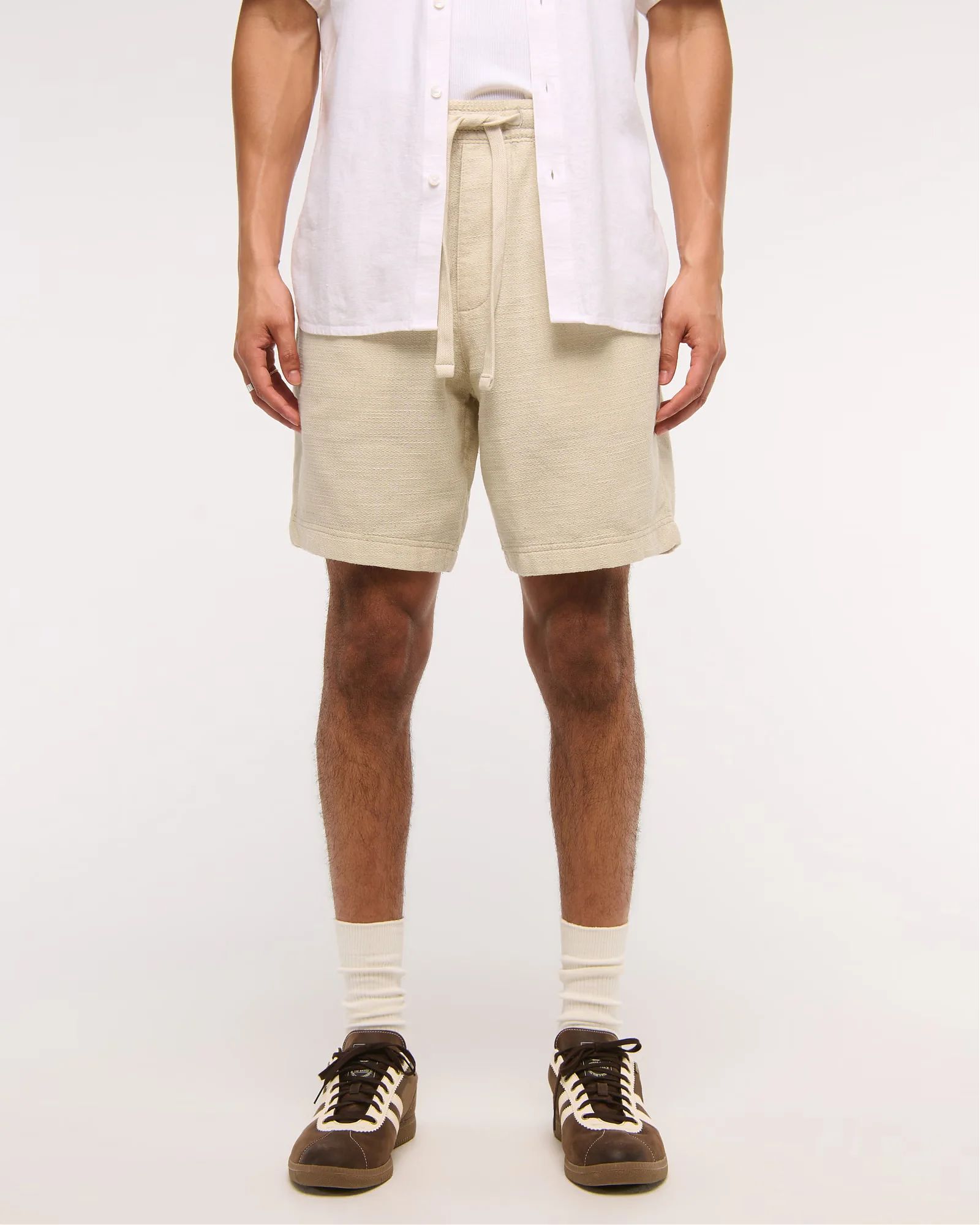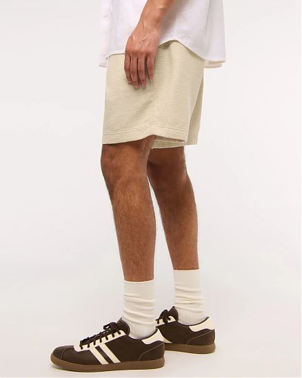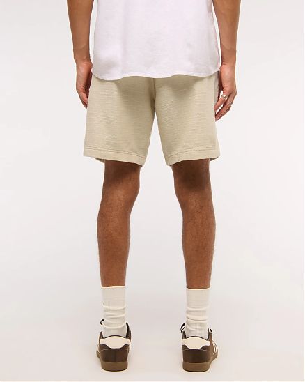 Комфортные мужские шорты Abercrombie & Fitch бежевого оттенка длиной 20 см в расслабленной посадке: фактурная ткань с лёгкой неоднородной текстурой, пояс на резинке со шнурком и карманы по бокам.
