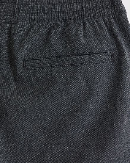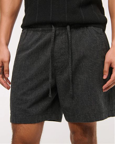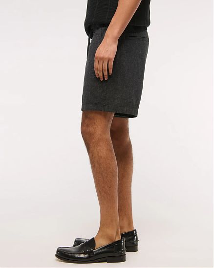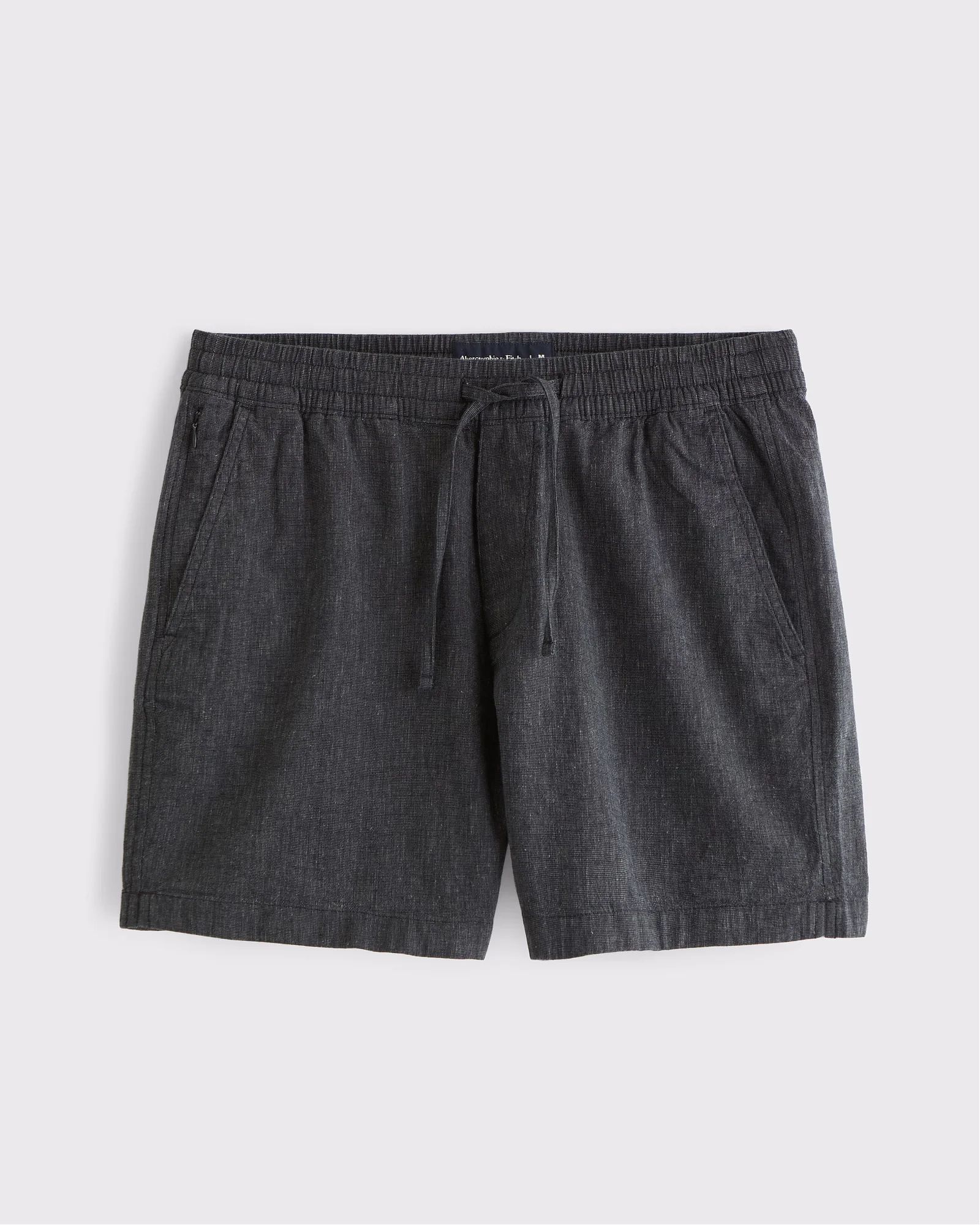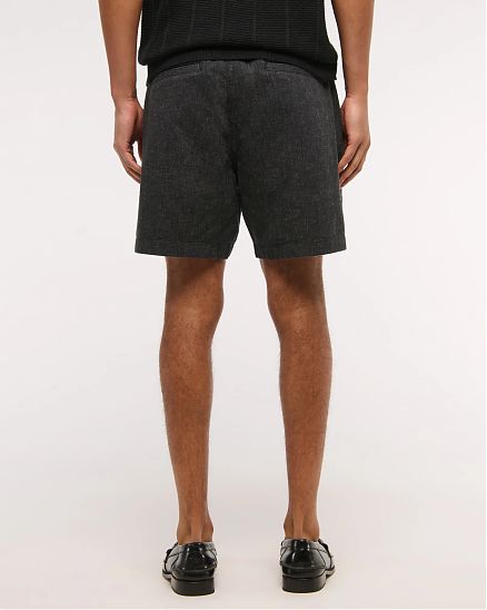 Комфортные мужские шорты Abercrombie & Fitch чёрного оттенка длиной 15 см в расслабленной посадке: лёгкая льняно‑хлопковая ткань, пояс на резинке со шнурком, карманы и скрытый карман на молнии.