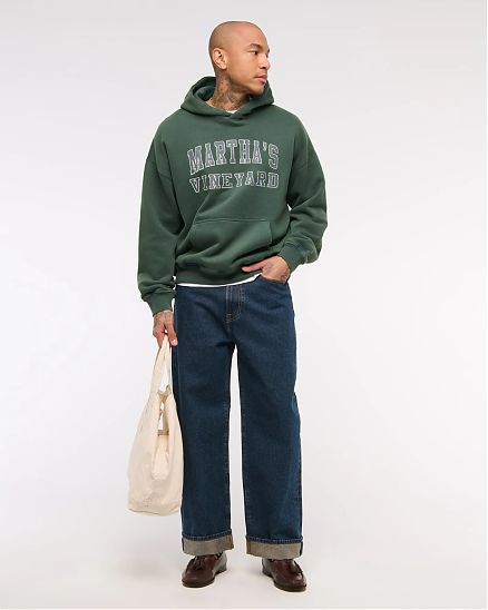 Оригинальная мужская толстовка Abercrombie & Fitch оверсайз из мягкой ткани SoftAF: принт «Martha’s Vineyard» на груди, карман‑кенгуру, манжеты и пояс на резинке, плечи кроя «дроп».