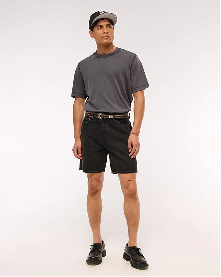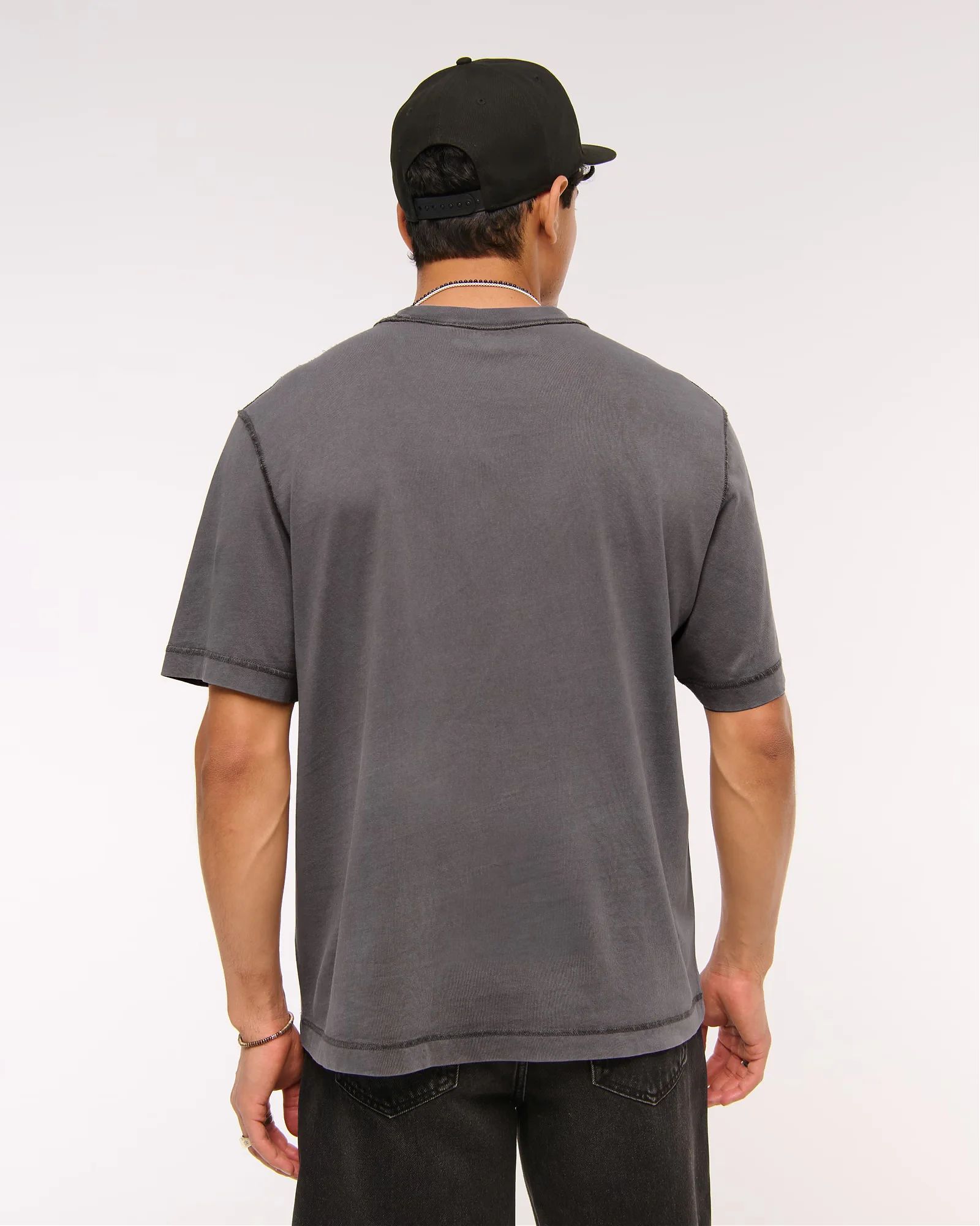 Комфортная мужская футболка Abercrombie & Fitch серого цвета из мягкой ткани SoftAF плотностью 180 г/м². Винтажный объёмный силуэт, круглый вырез, прямой низ и декоративные швы наружу. Посадка: Оверсайз.