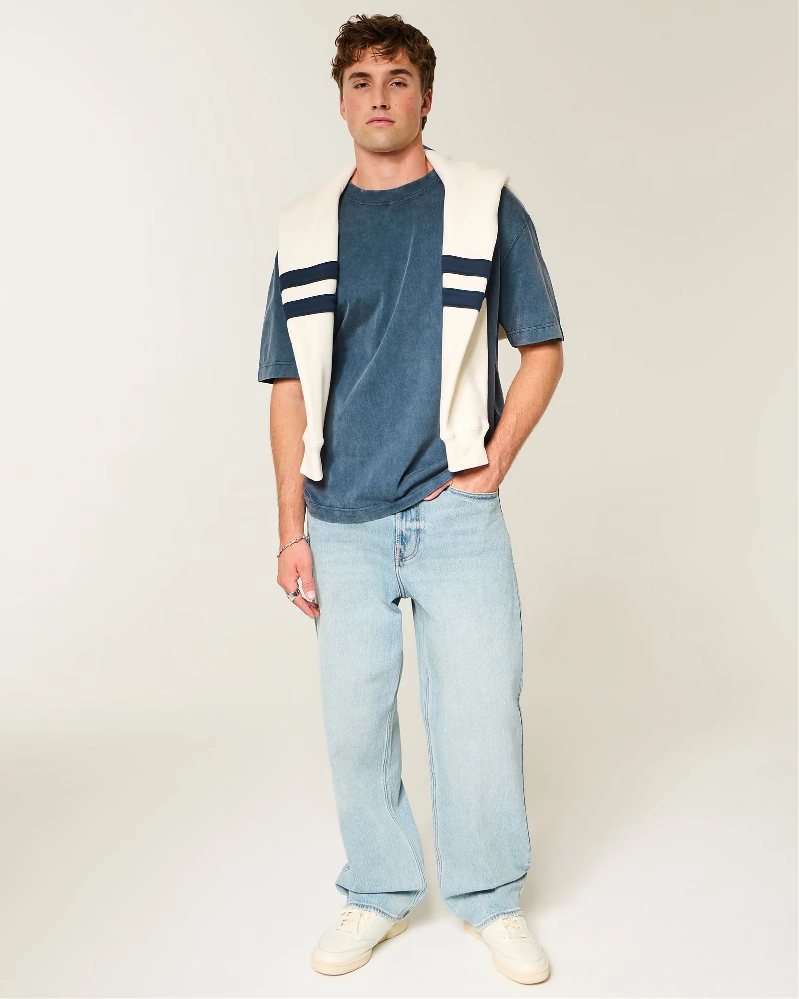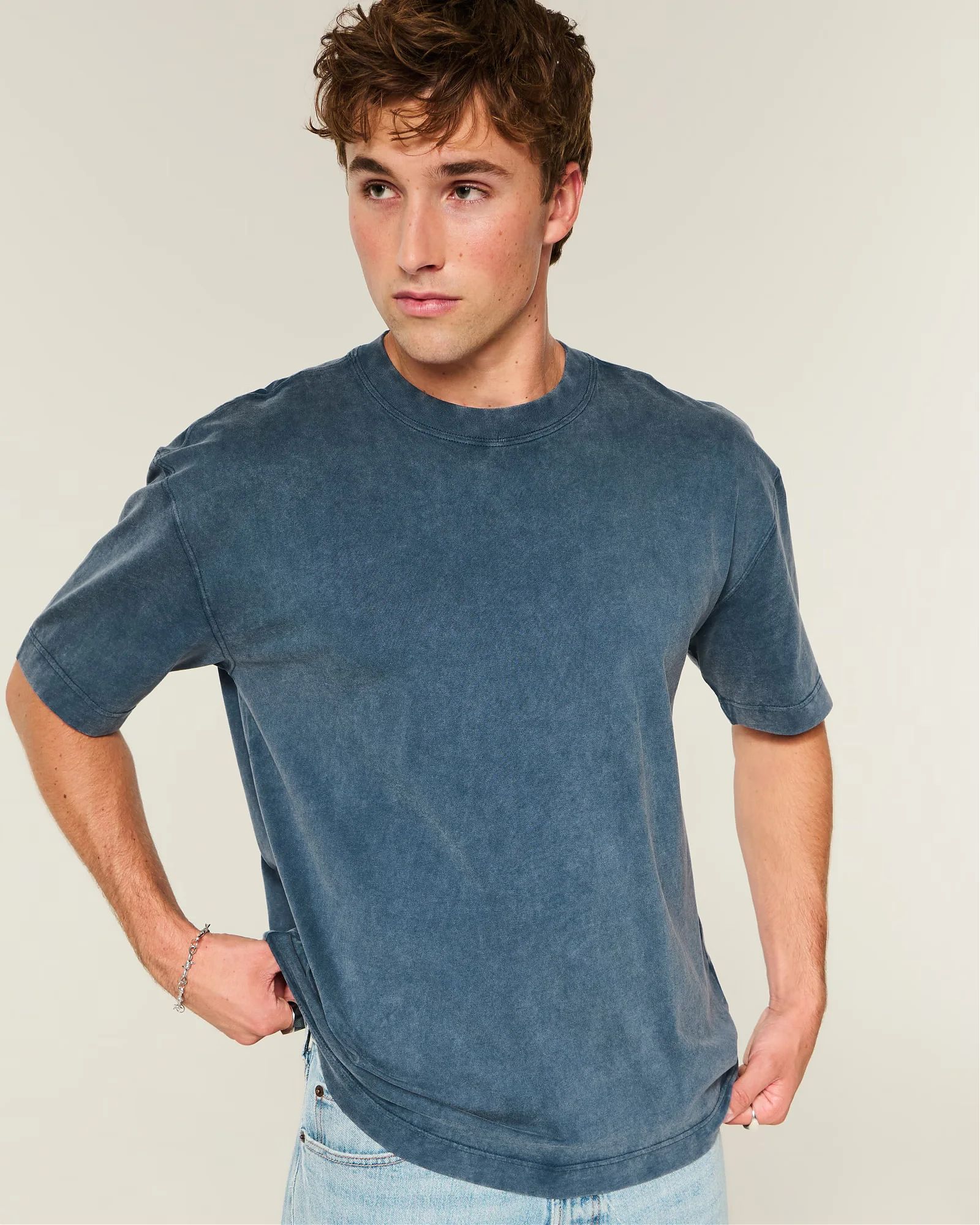 Комфортная мужская футболка Hollister выстиранного тёмно-синего оттенка из плотного хлопка с круглым вырезом и короткими рукавами.