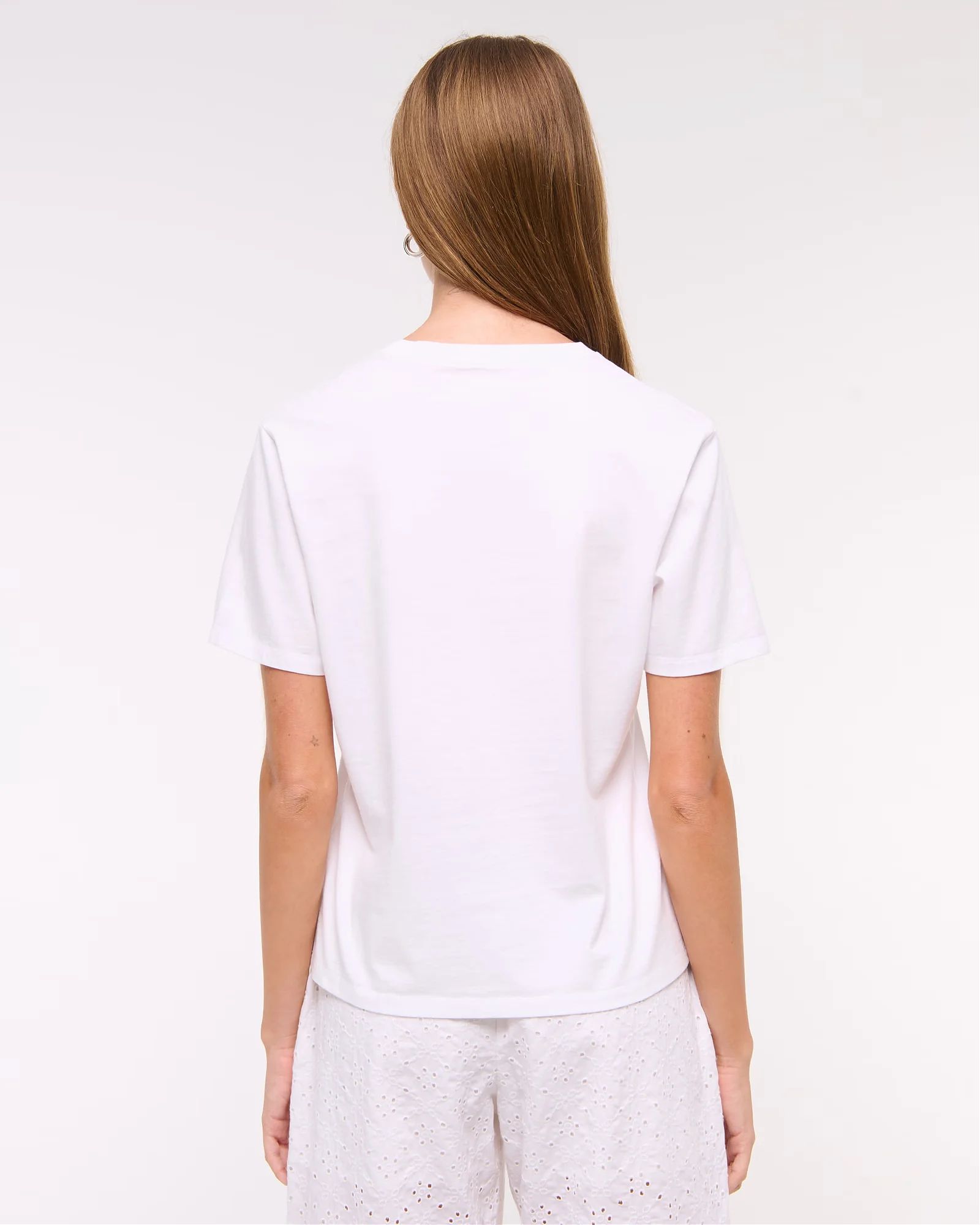 Оригинальная женская футболка Abercrombie & Fitch белого цвета из мягкой ткани SoftAF с принтом на груди, круглым вырезом и короткими рукавами, расслабленная посадка.