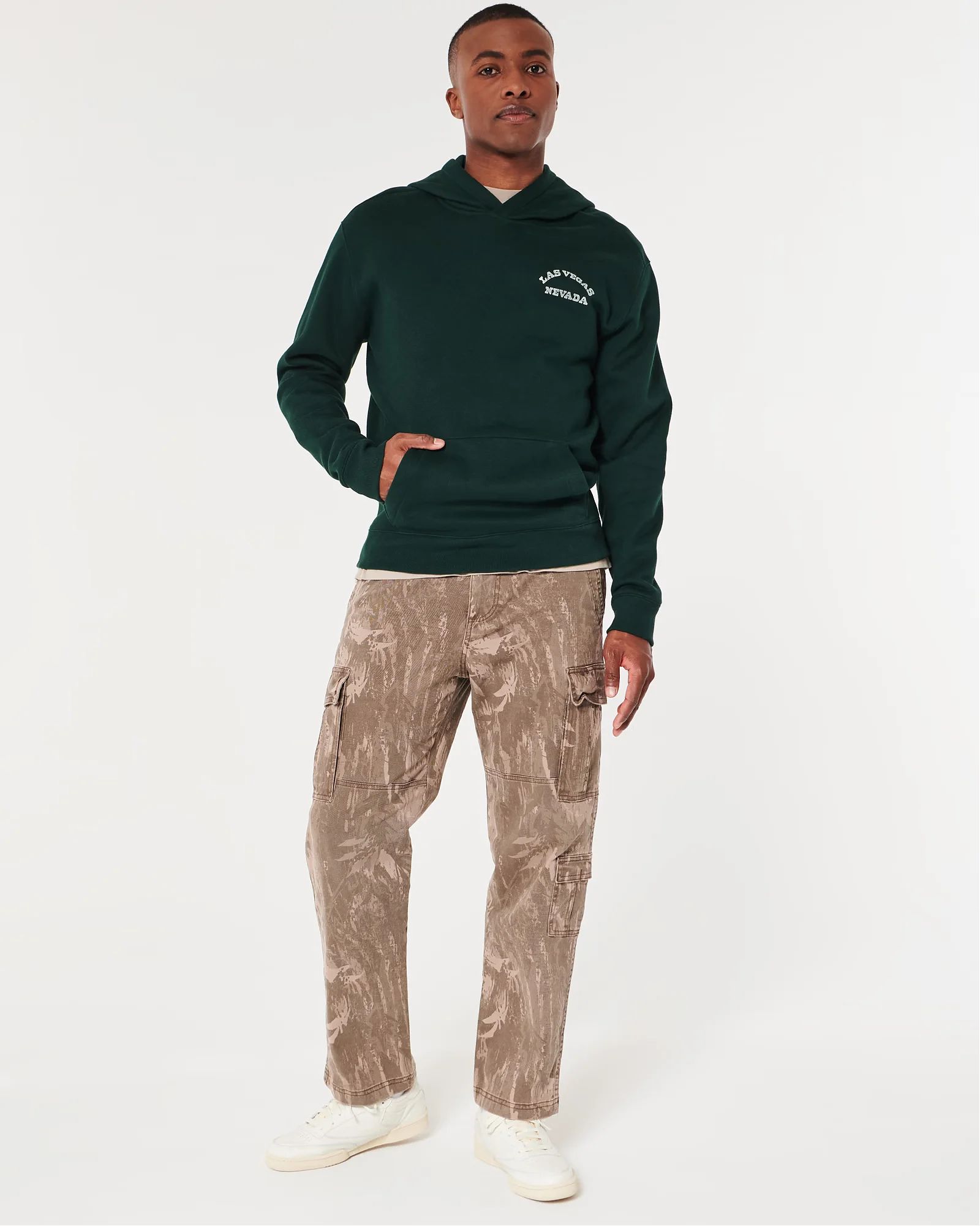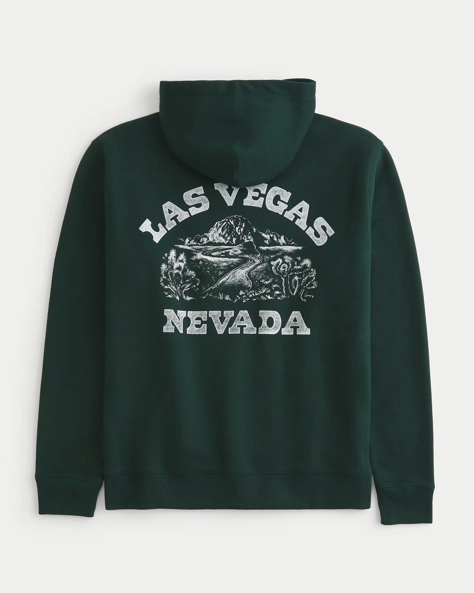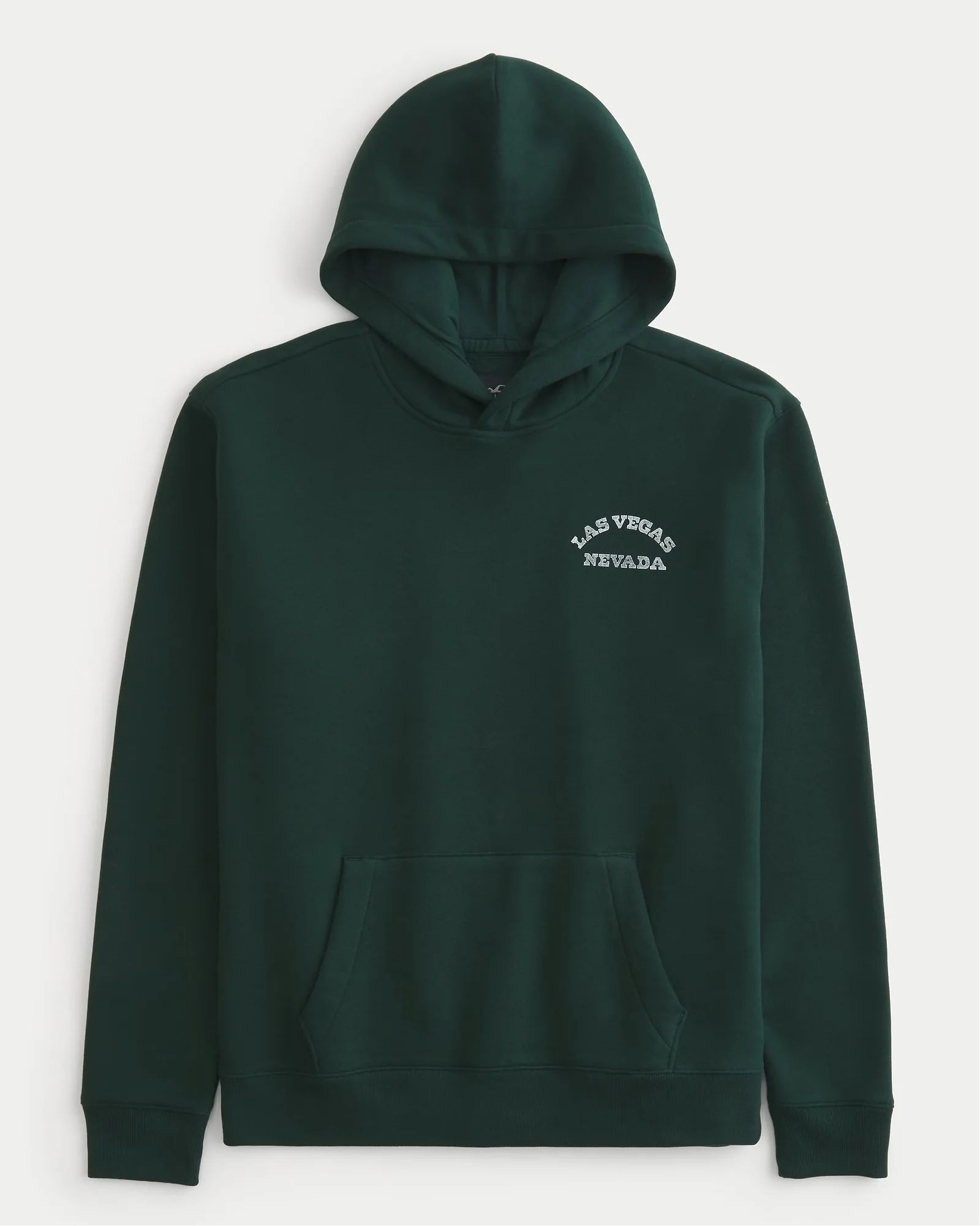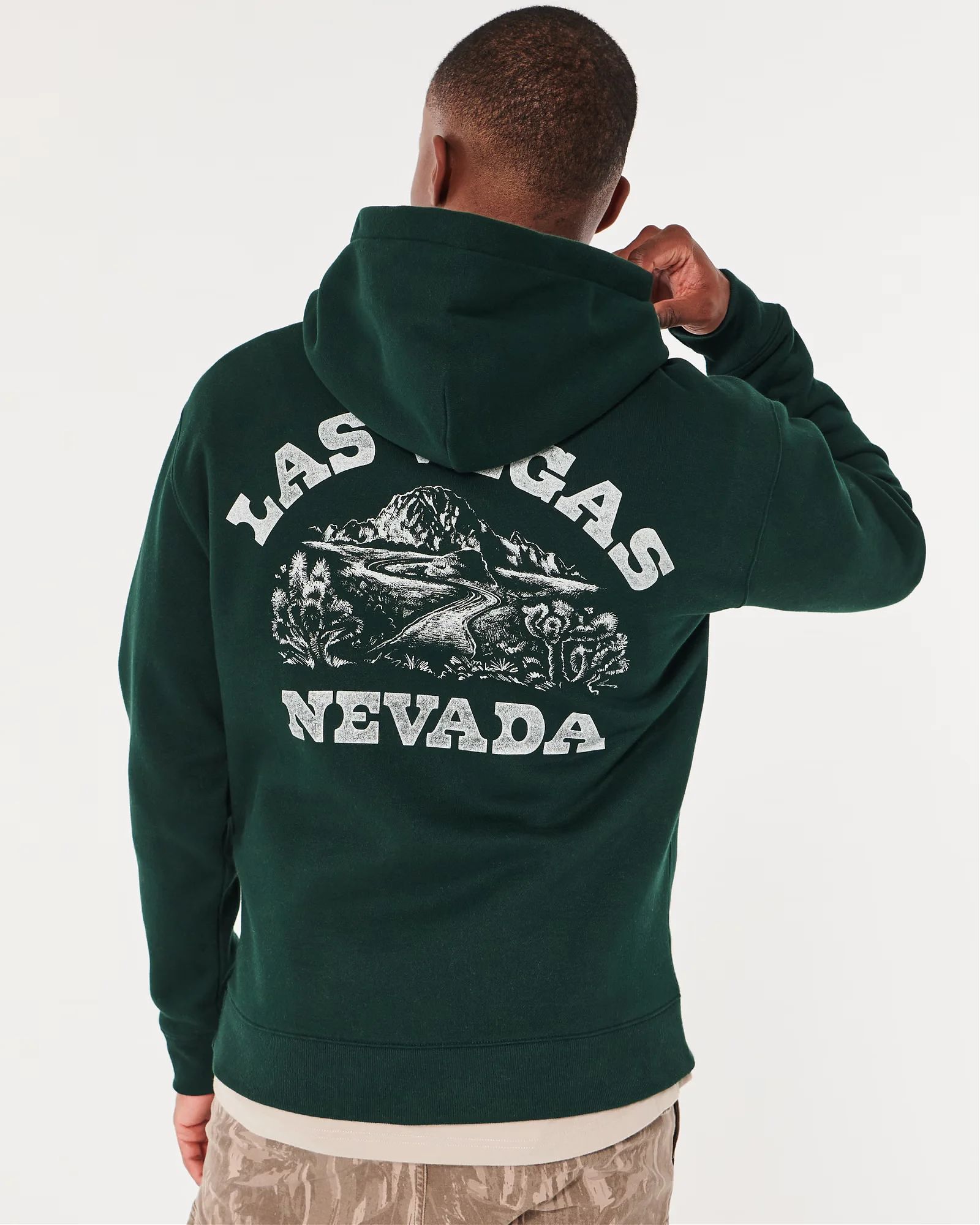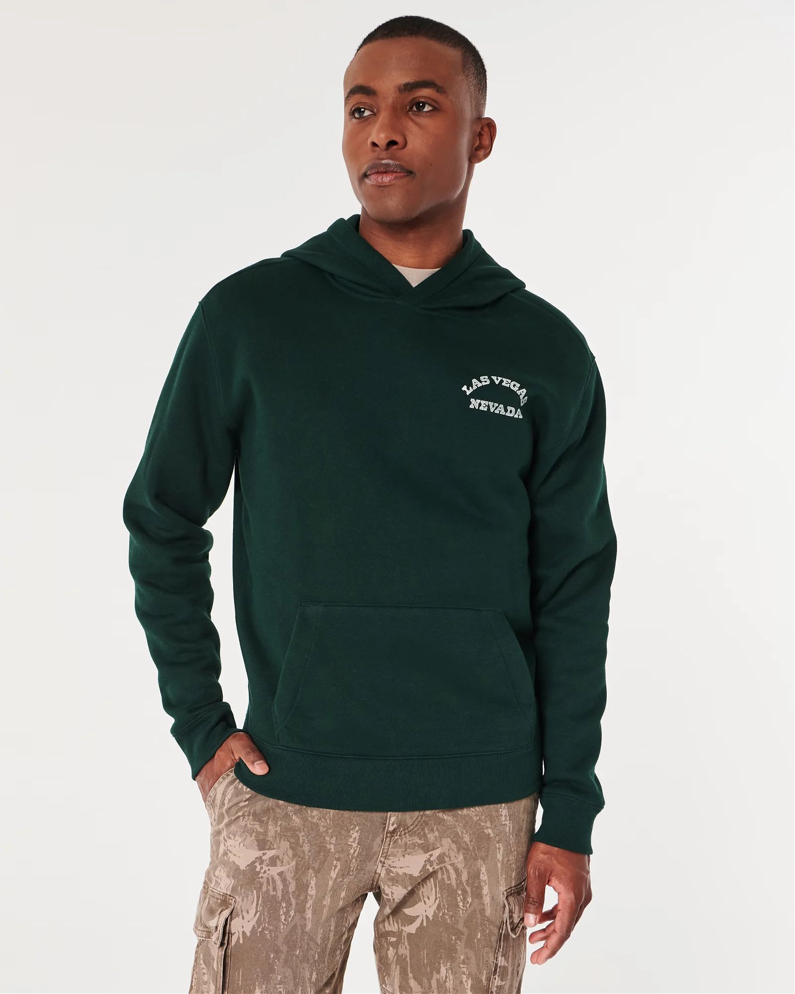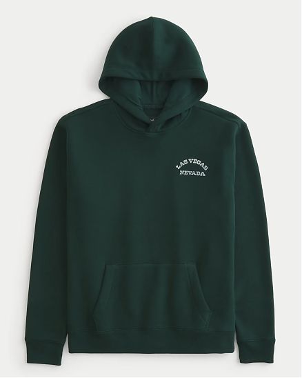 Сверхмягкая флисовая толстовка Hollister темно-зеленого цвета с принтом «Лас-Вегас-Невада» слева на груди и спине, длинными рукавами и карманом спереди. Расслабленная посадка.
