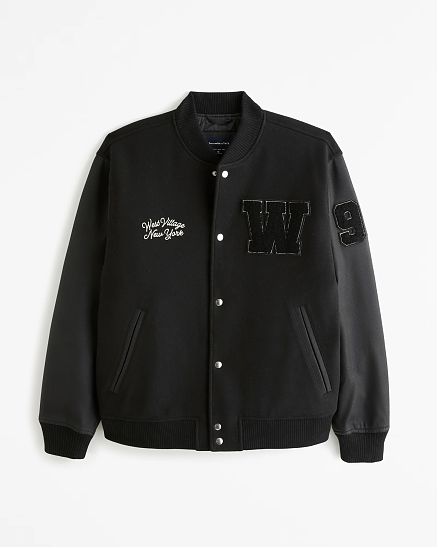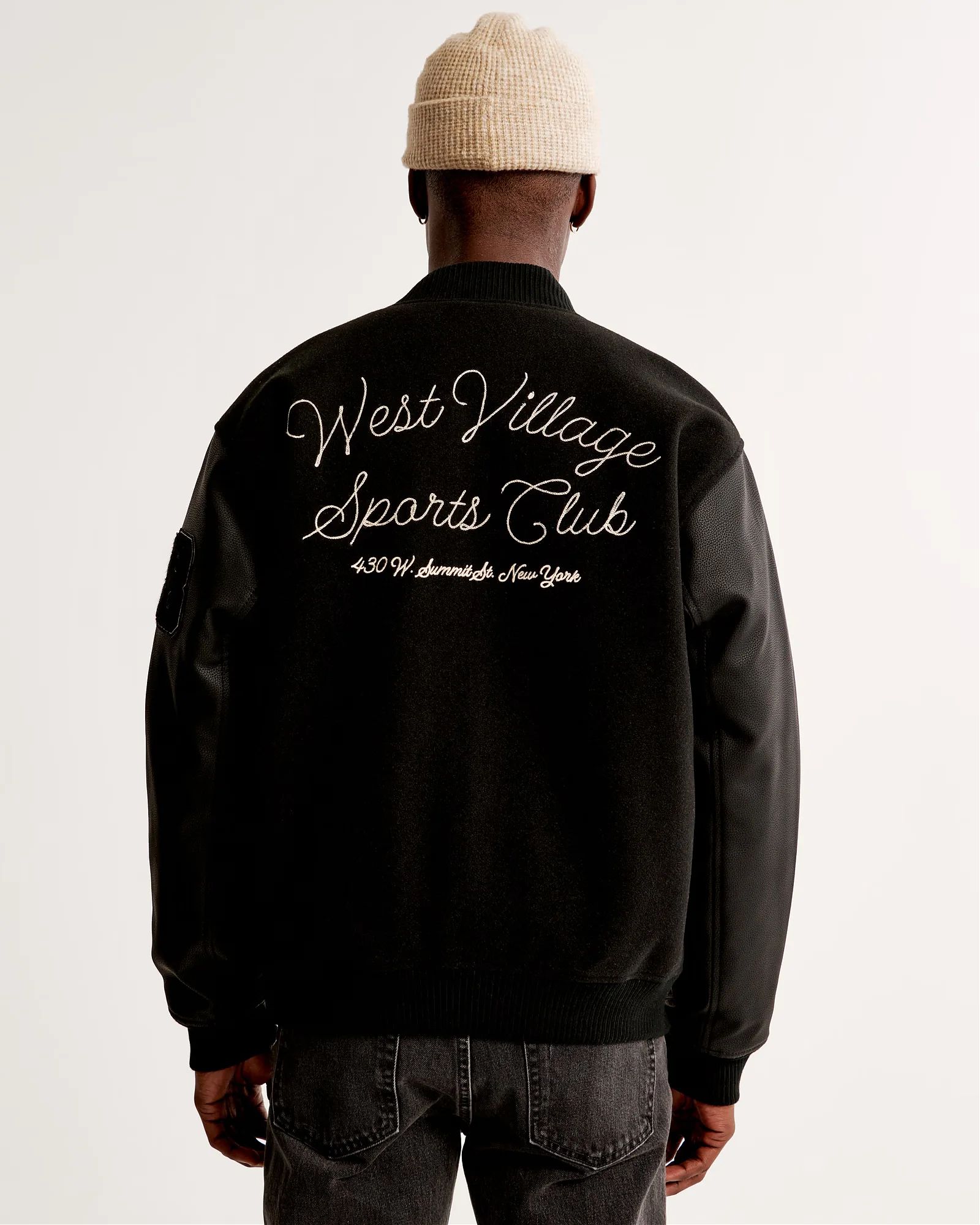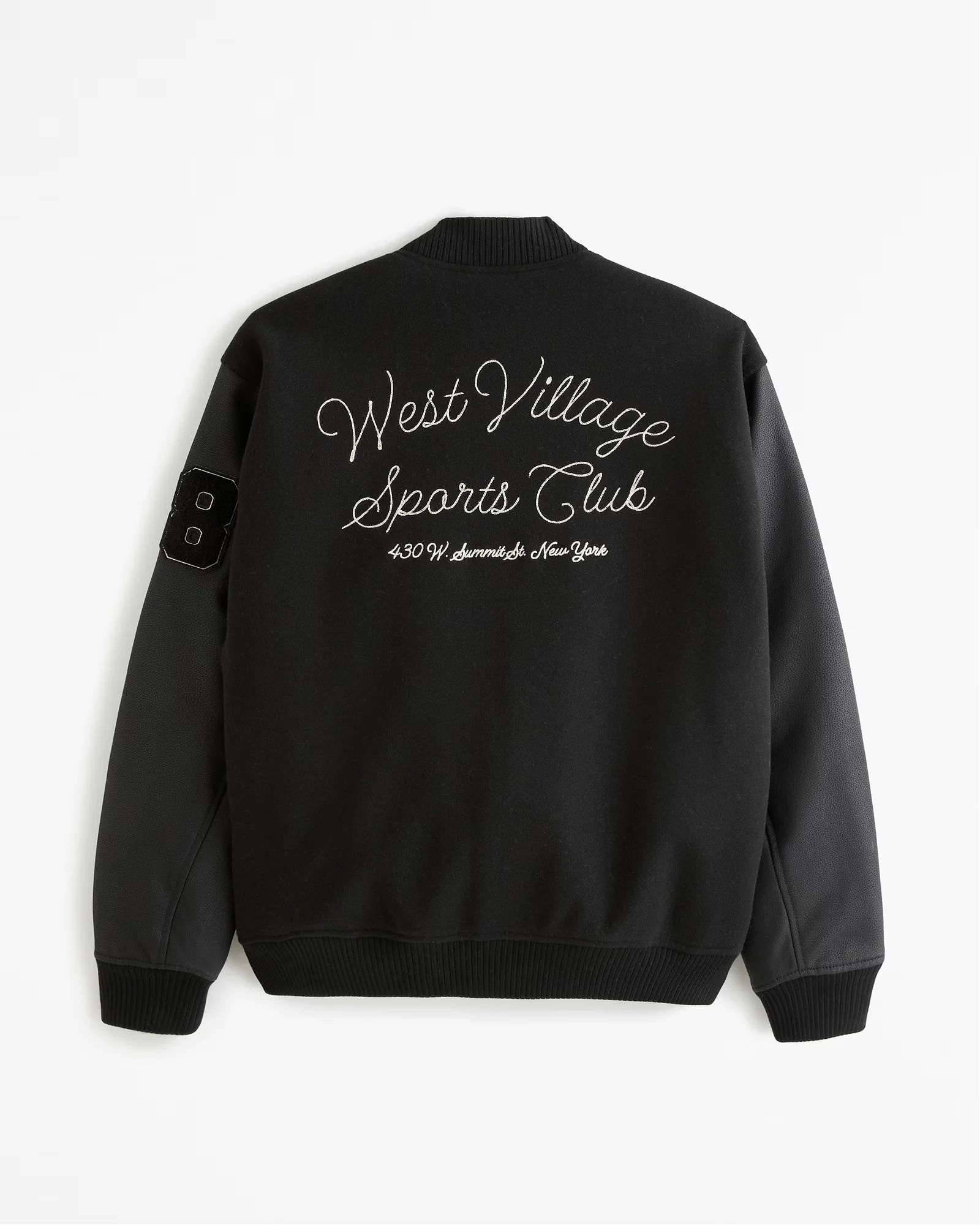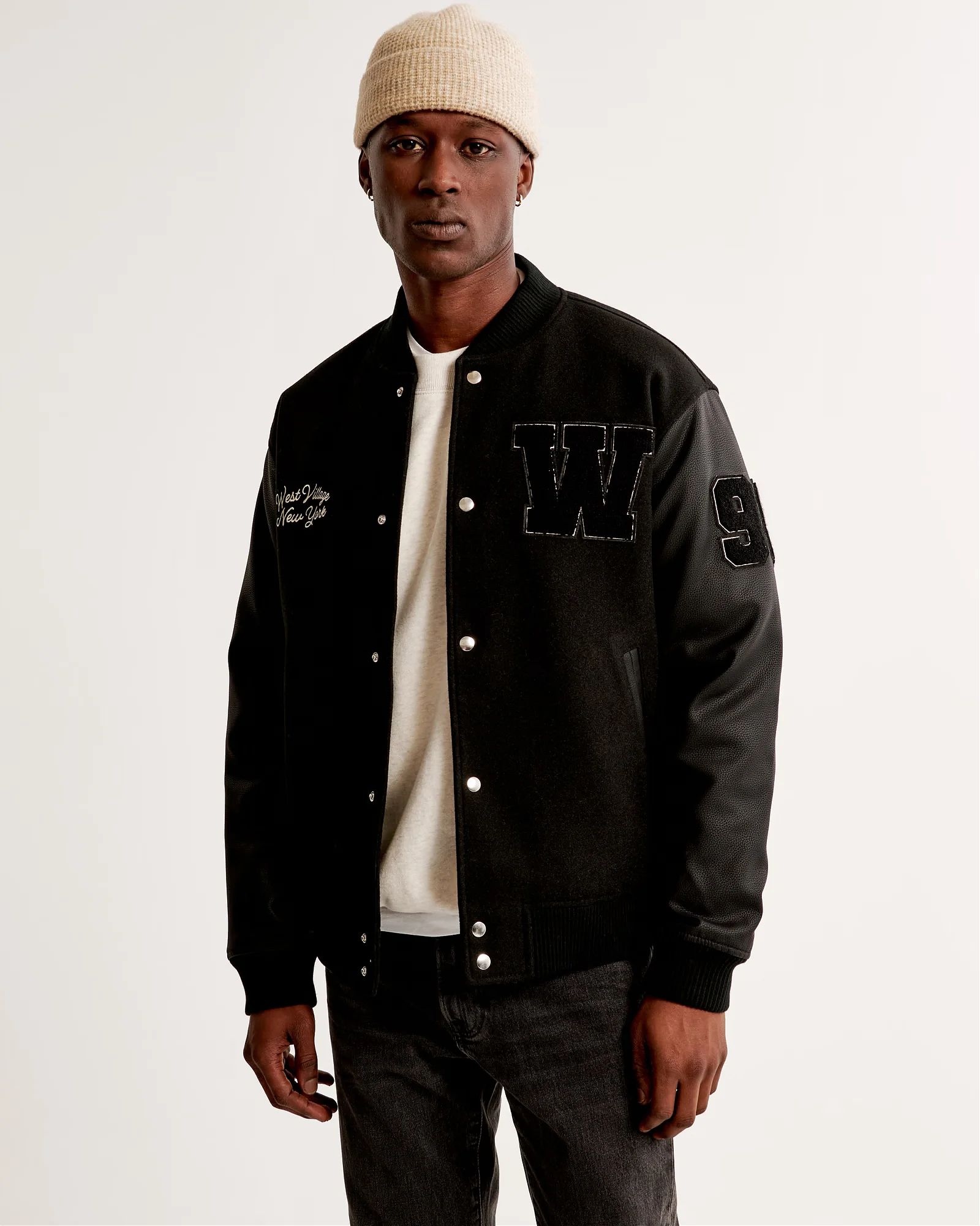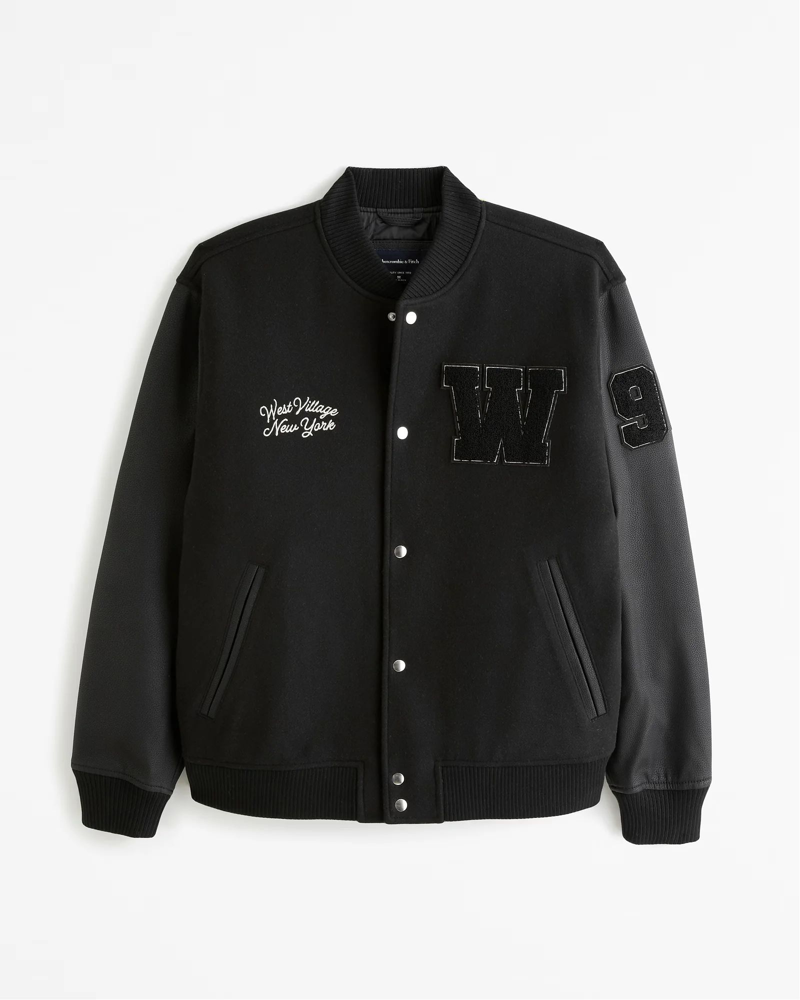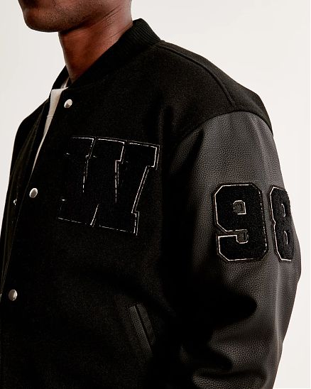 Классический бомбер Abercrombie & Fitch черного цвета из мягкой ткани и искусственной шерсти свободного кроя с контрастными рукавами из веганской кожи, вышитыми нашивками с логотипом на спине груди и левом рукаве, модным воротником, боковыми карманами, застежкой спереди и деталями на эластичных манжетах.