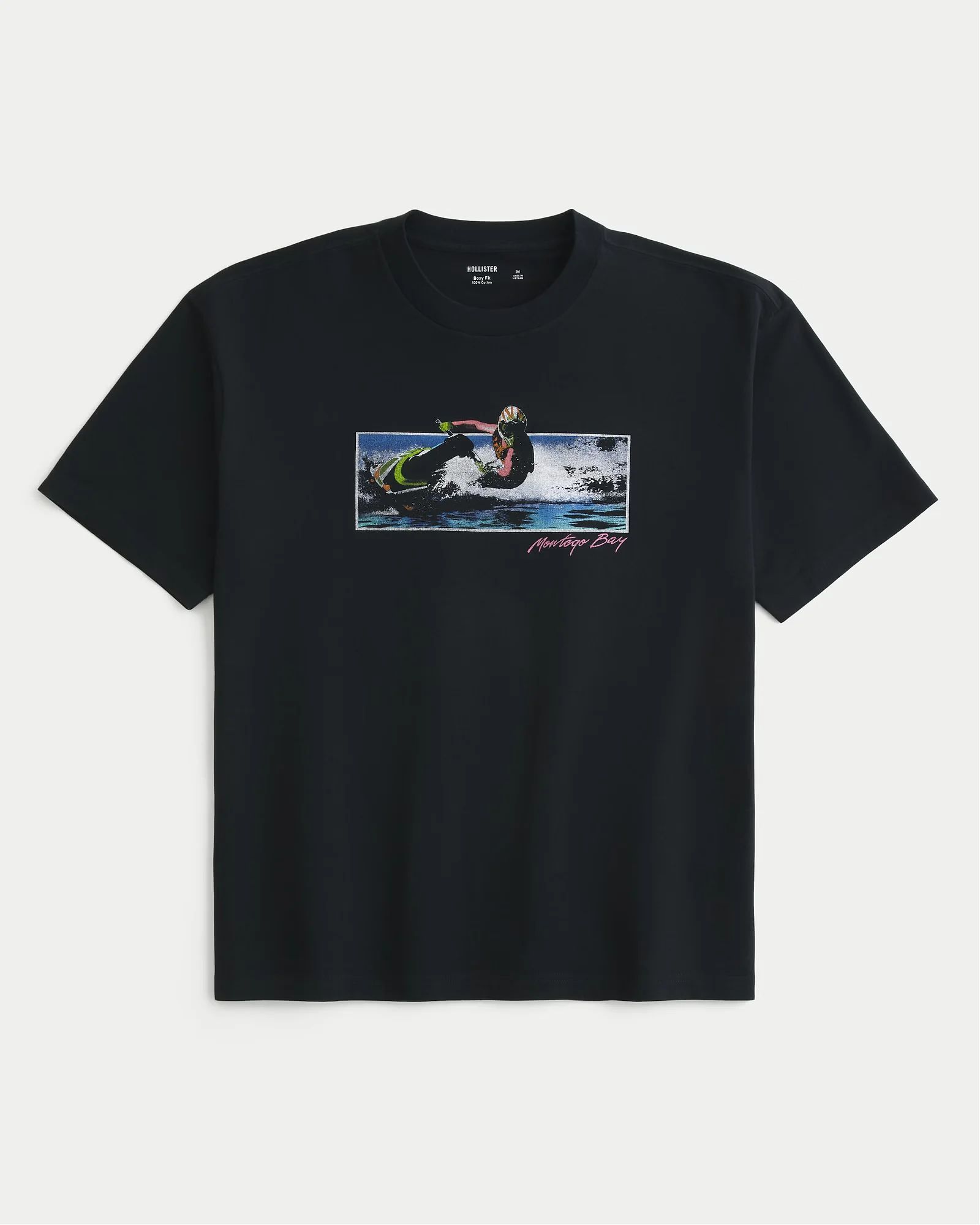 Мужская футболка Hollister черного цвета: прямая посадка Boxy Fit, круглый вырез, принт Монтего бэй Ямайка на груди и на спине.