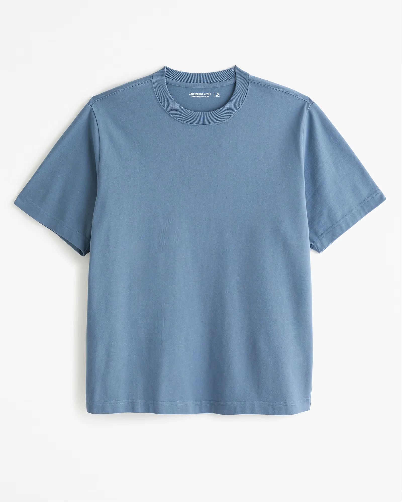 Классическая, премиальная футболка Abercrombie & Fitch синего цвета с коротким рукавом из плотной ткани softAF 275 г с биополировкой, которая создает ощущение чистоты и свежести на ощупь. Свободный силуэт.