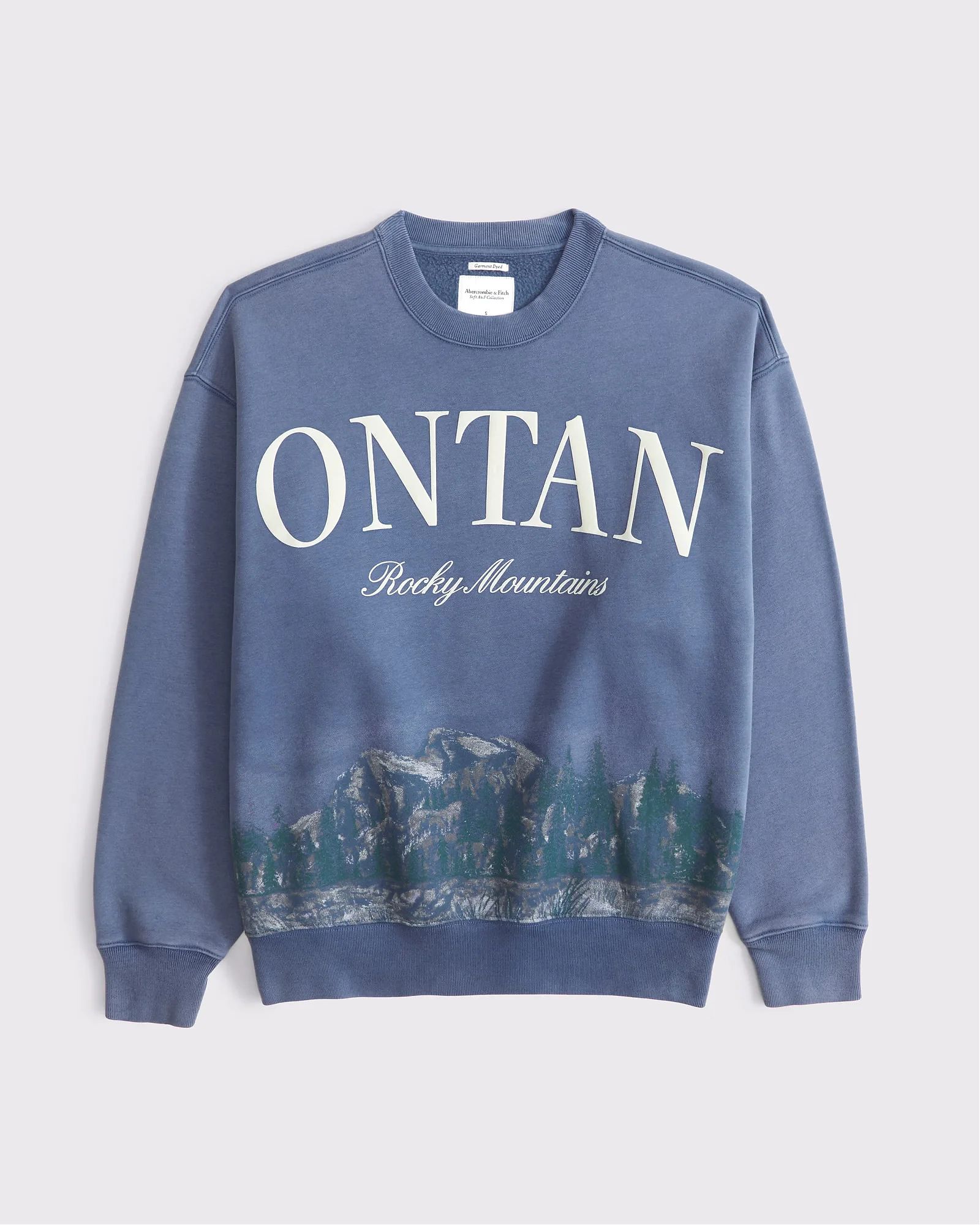 Удобный свитшот Abercrombie & Fitch синего цвета с фирменным принтом на груди и спине. Фирменный флис Soft A&F и удобная длина для леггинсов. Широкая линия груди, графические детали в стиле горнолыжных курортов, вырез и окантовка снизу и на манжетах.