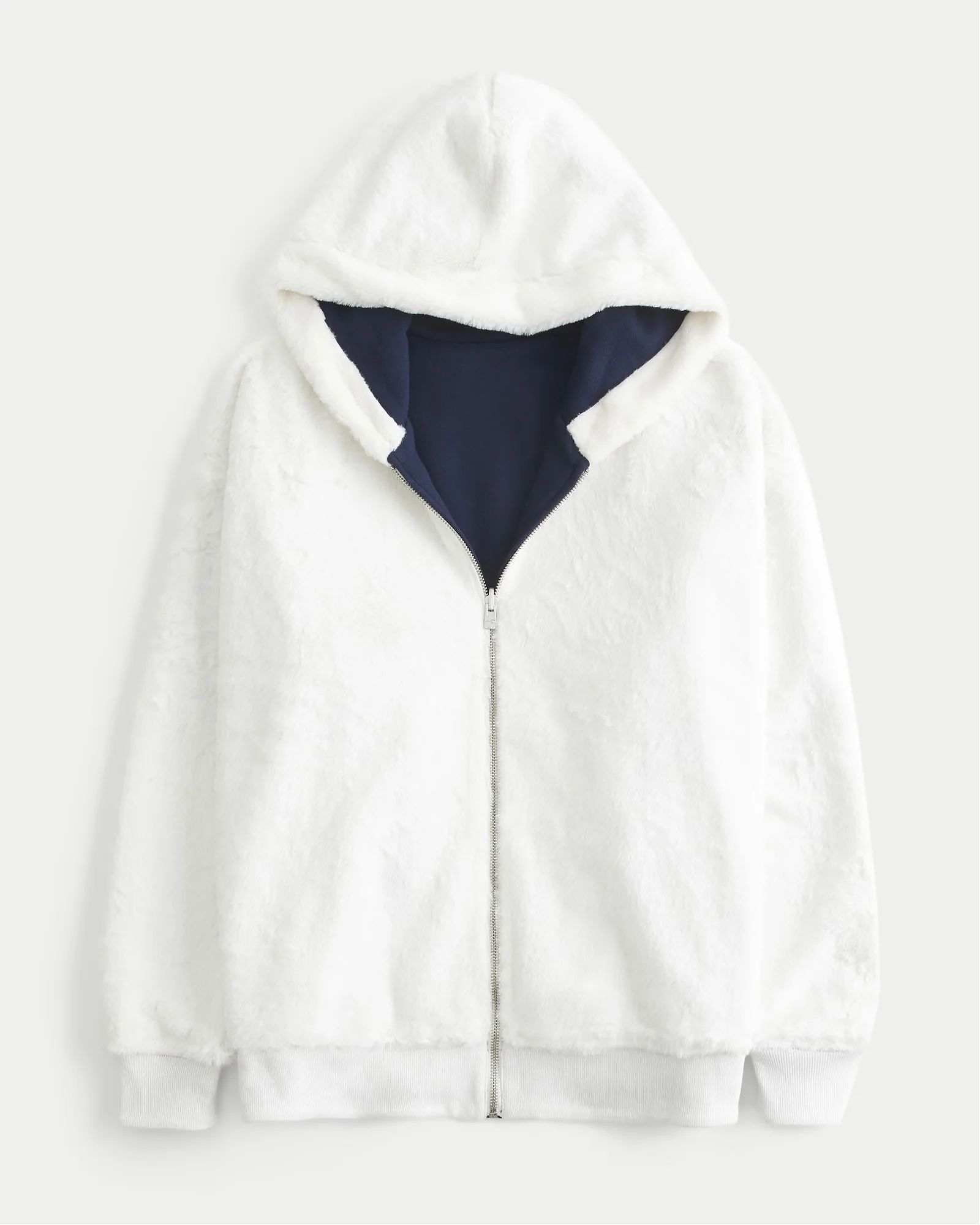 Новая женская двусторонняя толстовка Hollister тёмно-синего оттенка из мягкого флиса с подкладкой из искусственного меха, застёжкой на молнии, карманами и длинными рукавами.