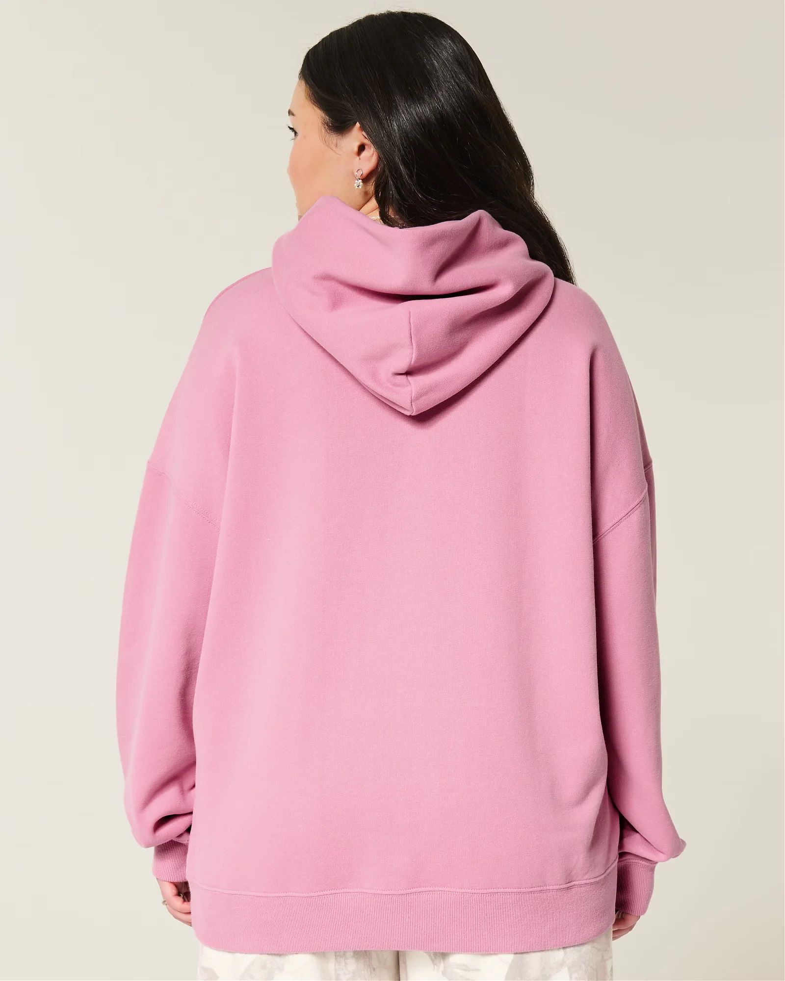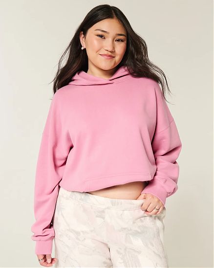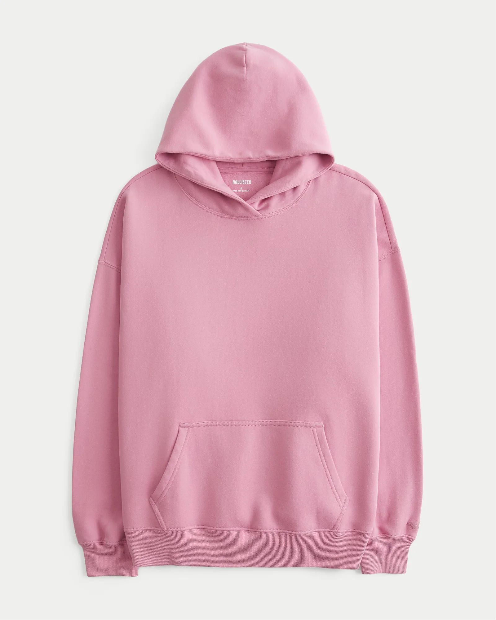 Комфортная женская толстовка Hollister розового оттенка: мягкий флис, объёмный капюшон, длинные рукава и передний карман‑кенгуру, свободная посадка.