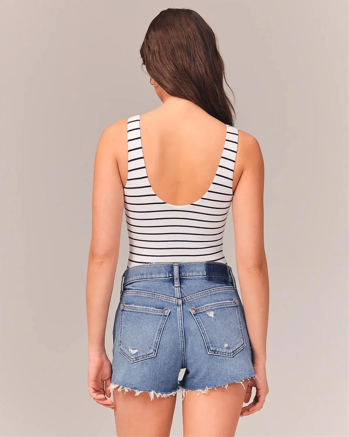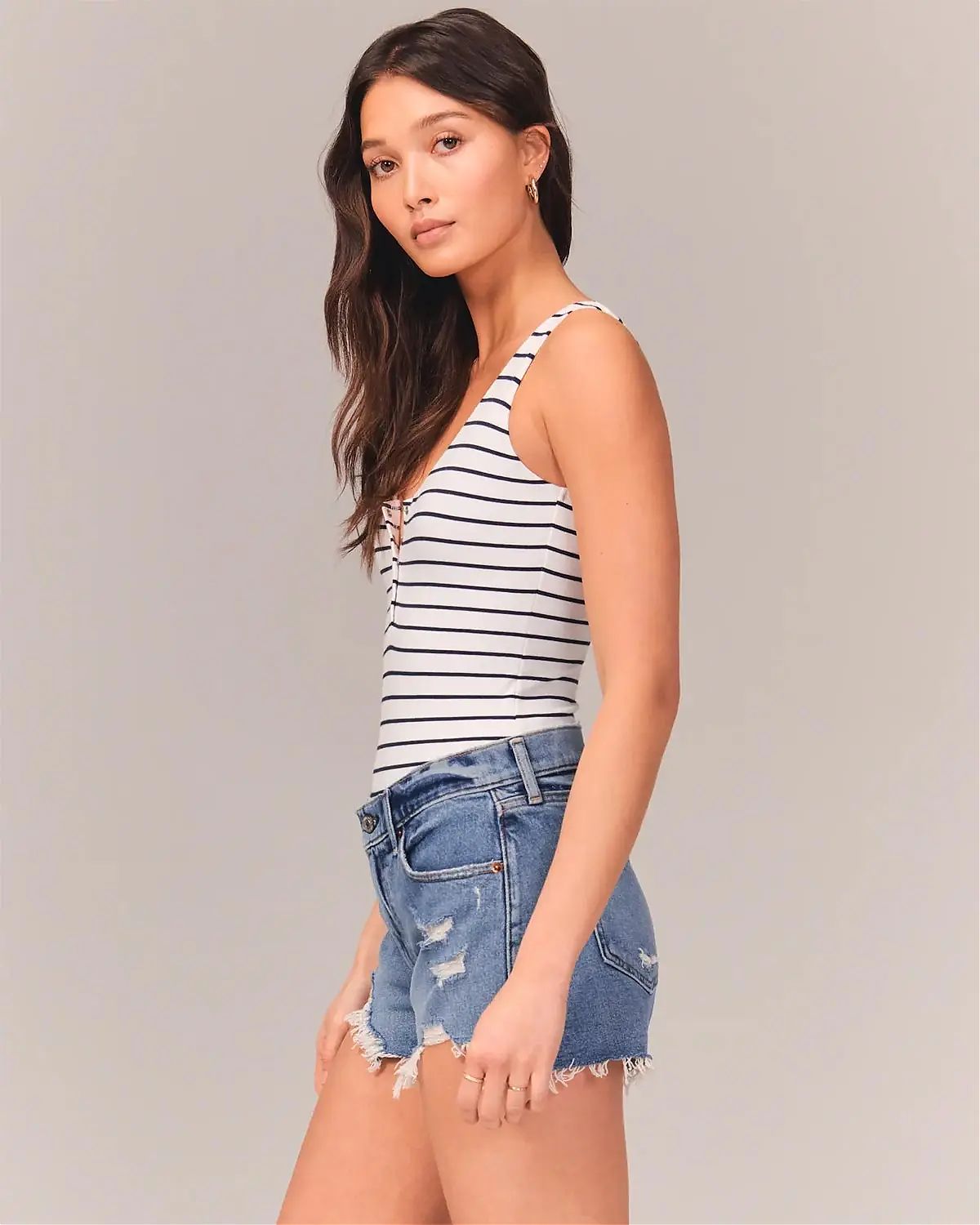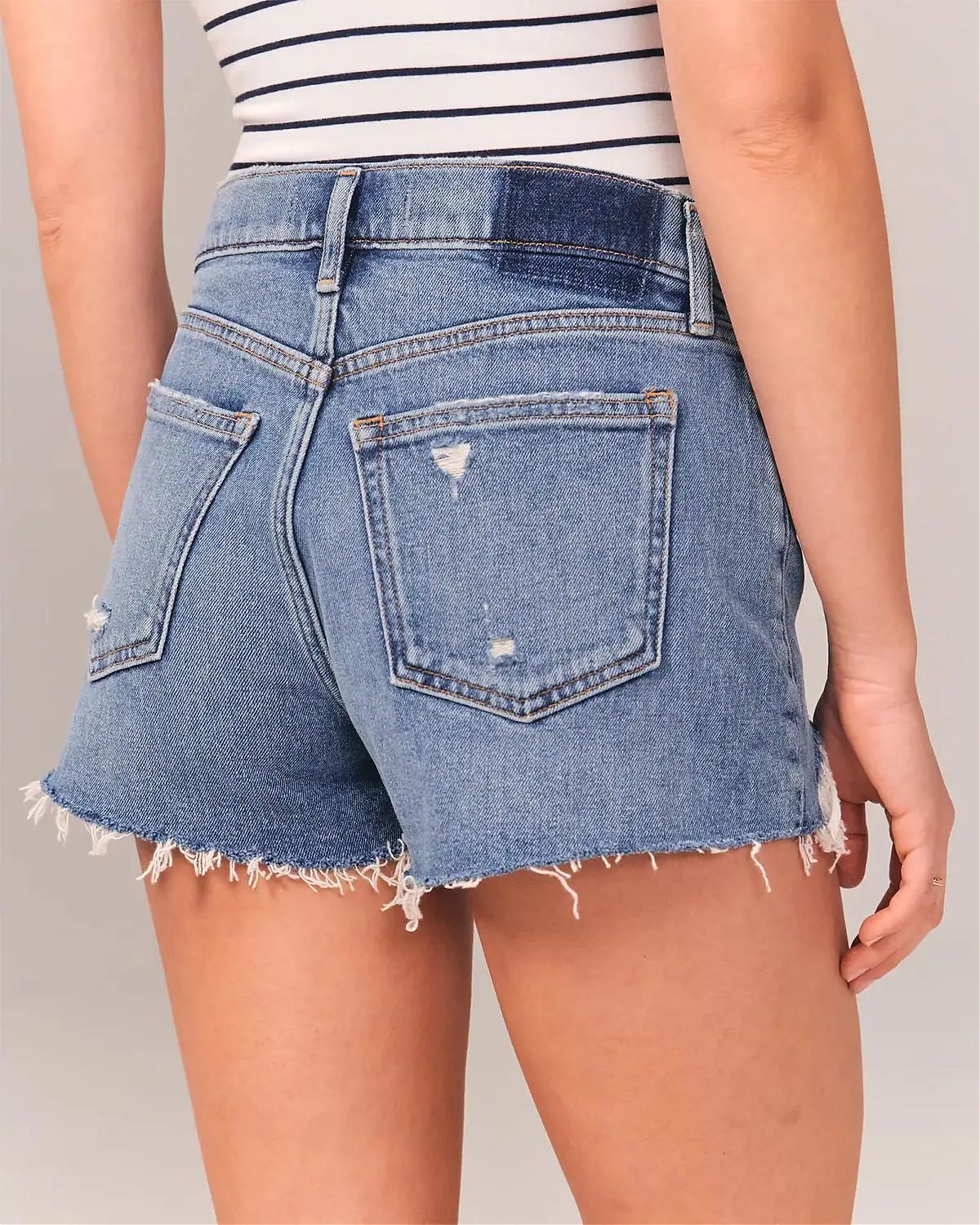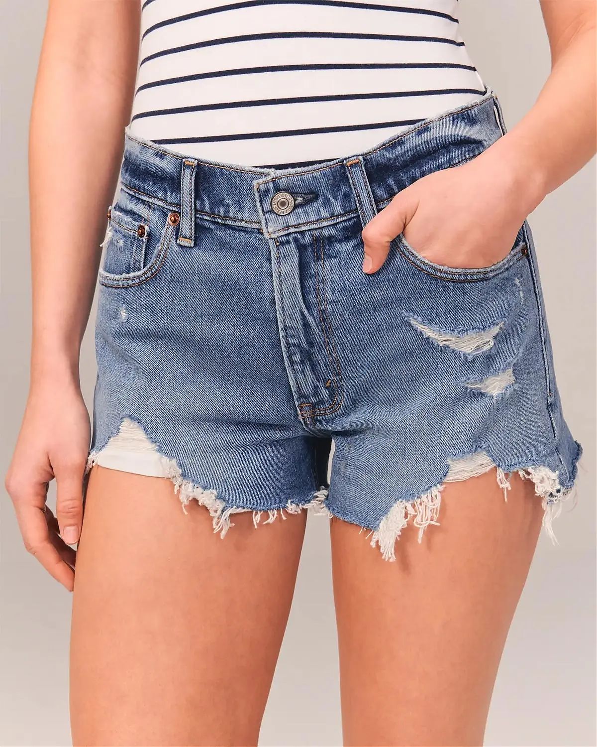 Джинсовые шорты Abercrombie Fitch синего цвета со средней посадкой с рваными элементами и потертыми деталями, а также рваным краем.