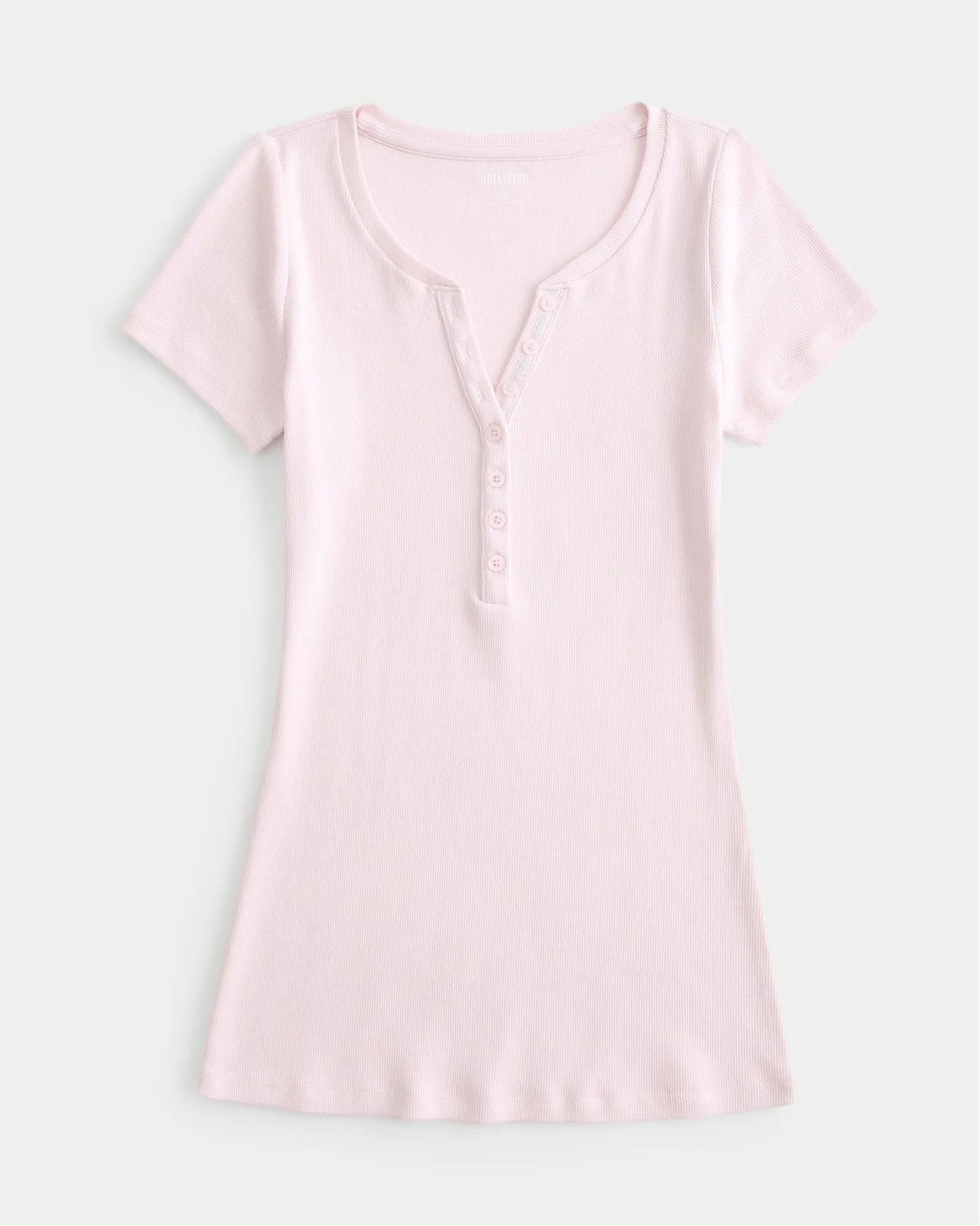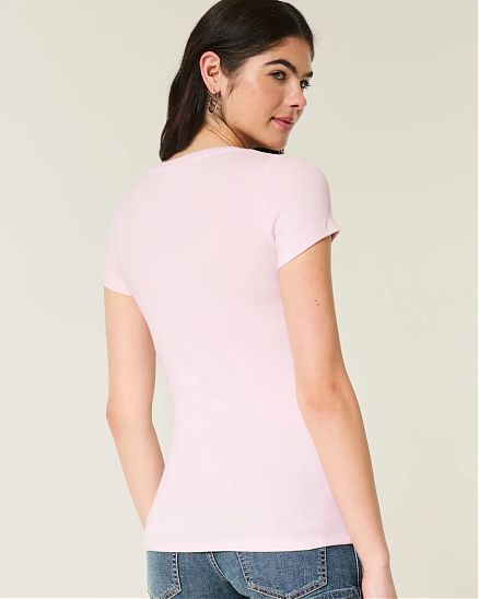 Оригинальная женская футболка Henley Hollister светло‑лилового оттенка: приталенный крой, короткие рукава, планка на пуговицах и удлинённая посадка по фигуре.