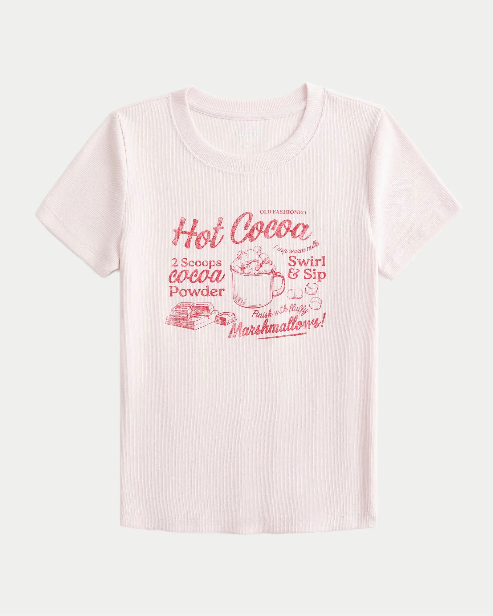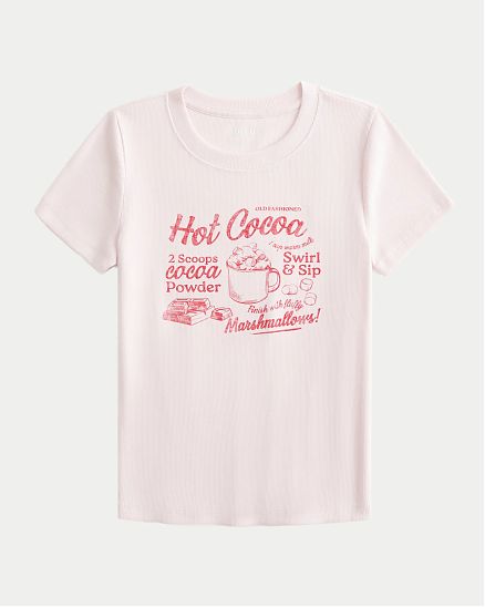 Новая женская футболка Hollister светло-лилового оттенка из мягкого хлопка с эластаном, принтом «Хот Кокоа», круглым вырезом и короткими рукавами, выполнена в приталенной посадке.