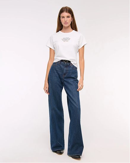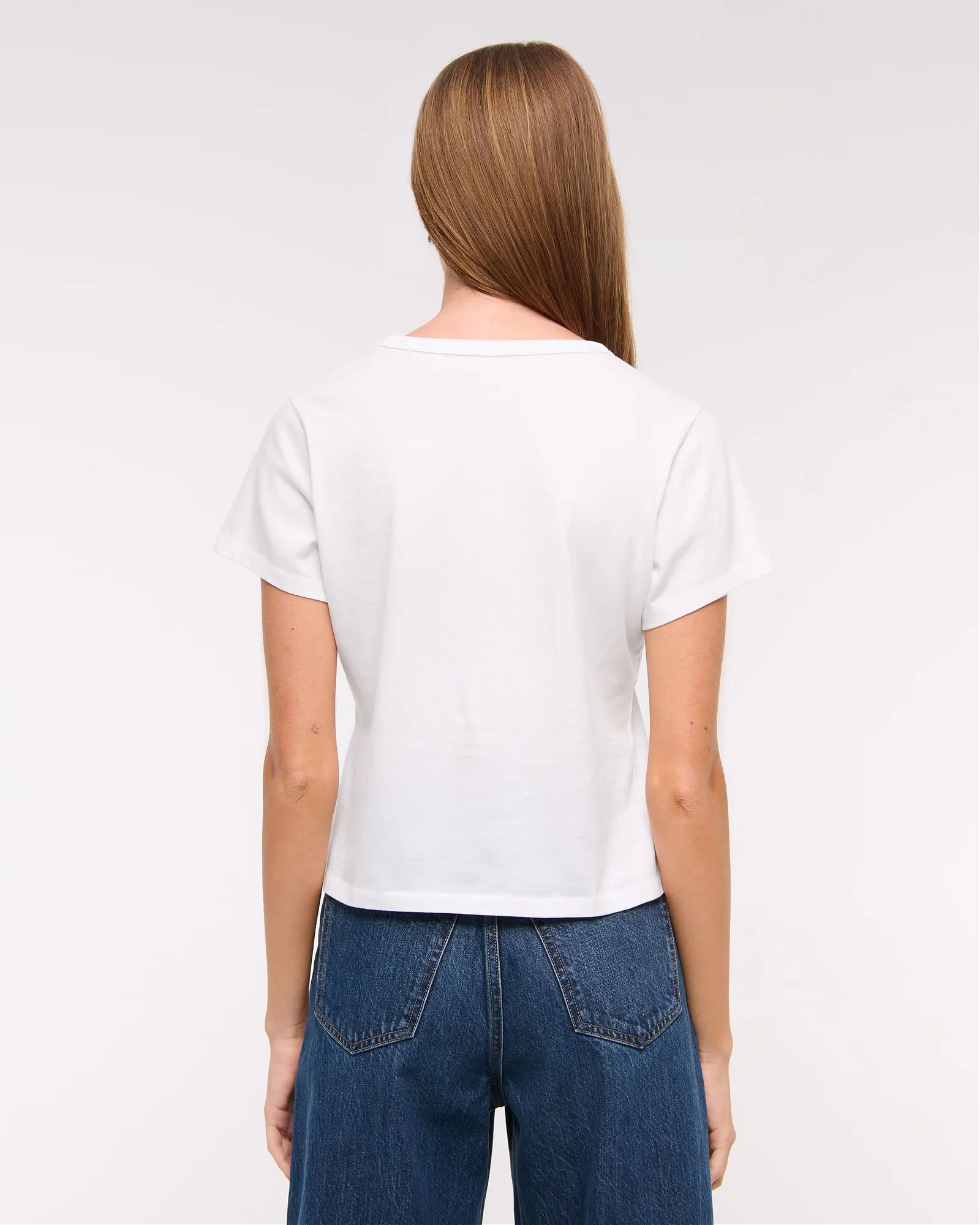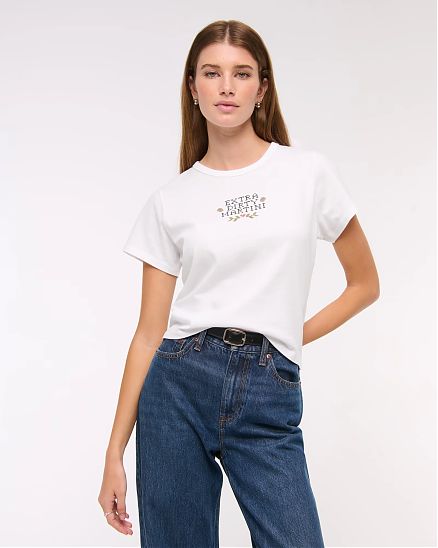 Комфортная женская футболка Abercrombie & Fitch белого оттенка с графикой «мартини». Хлопок softAF, слегка укороченная длина, прямой крой и круглый вырез — удобно на каждый день.